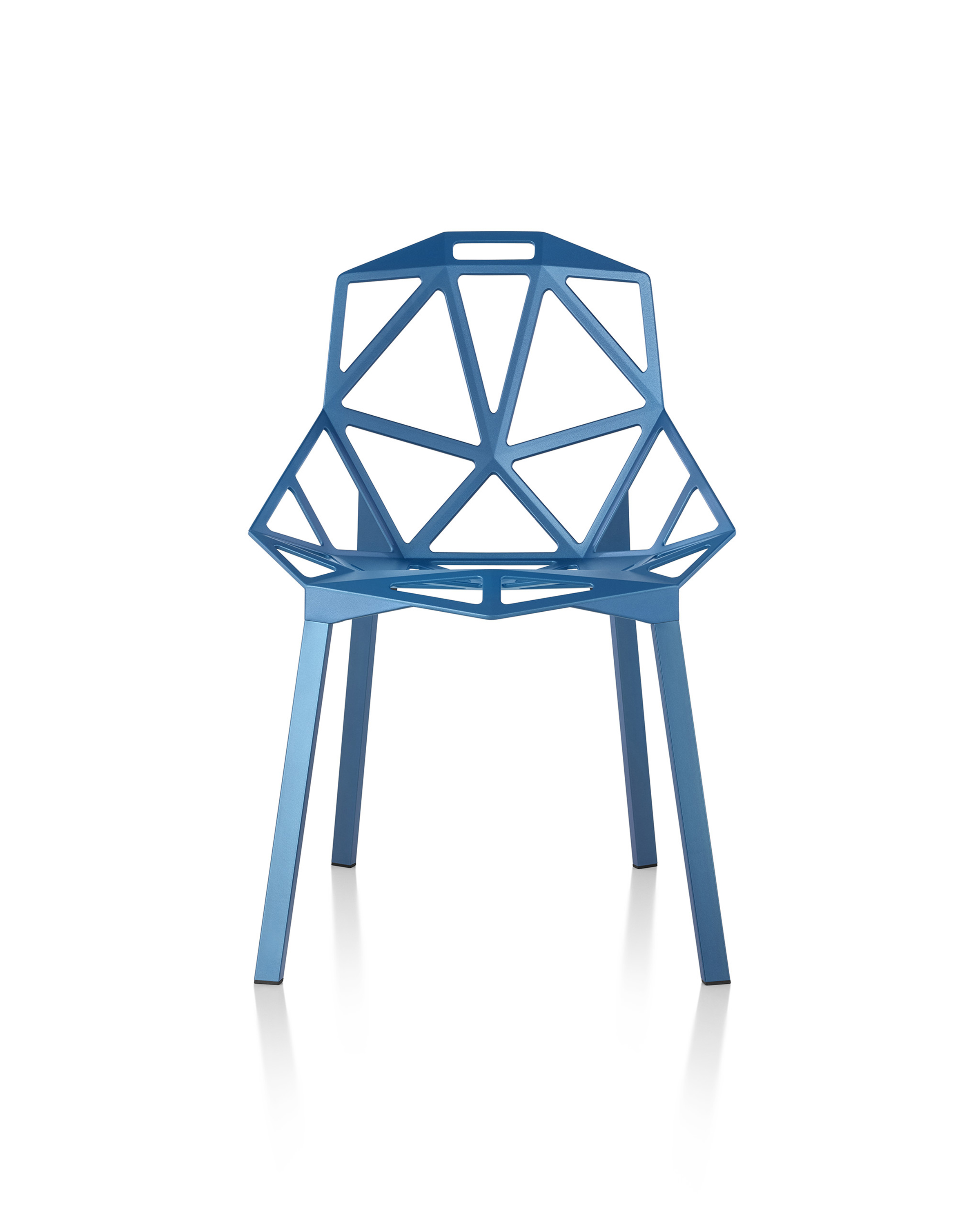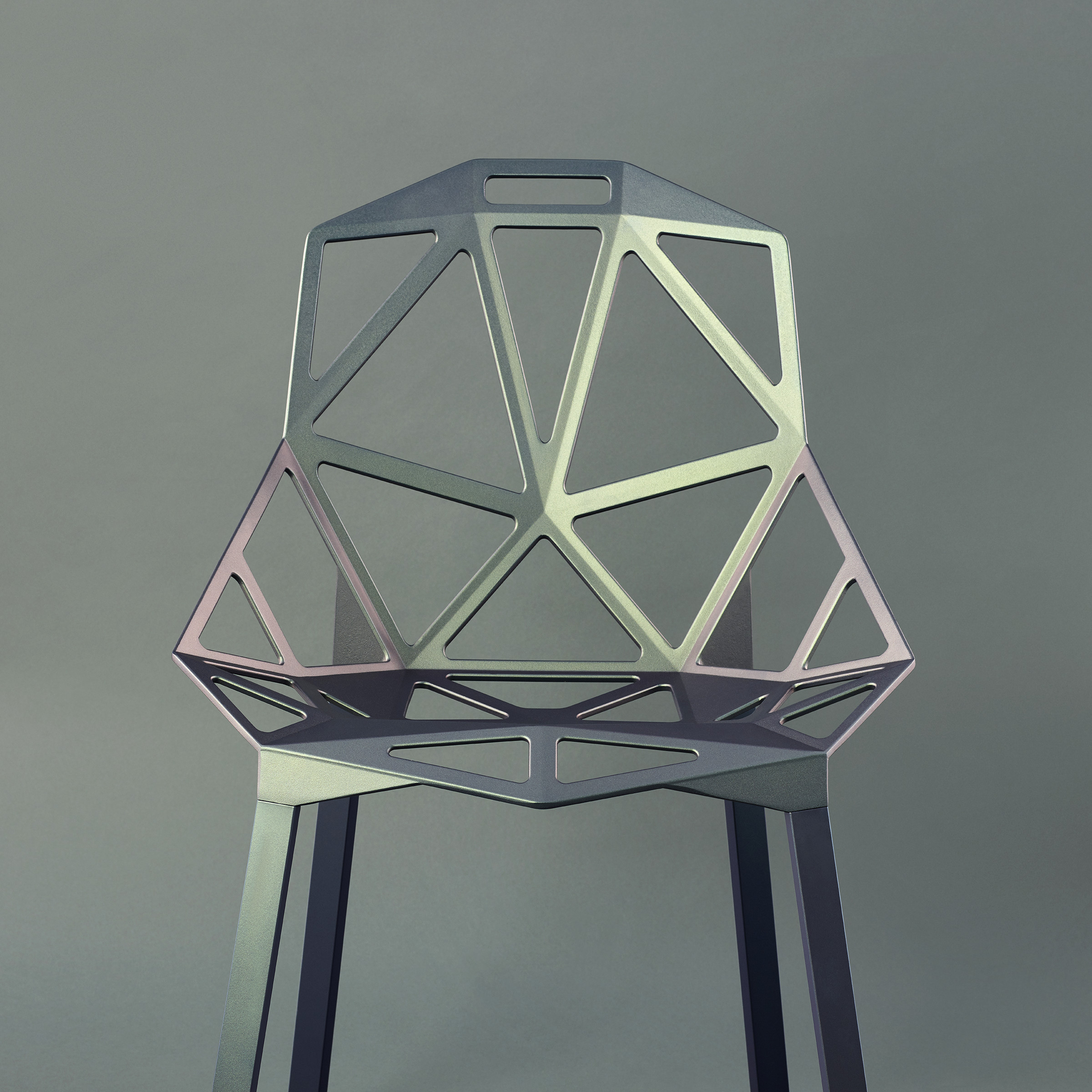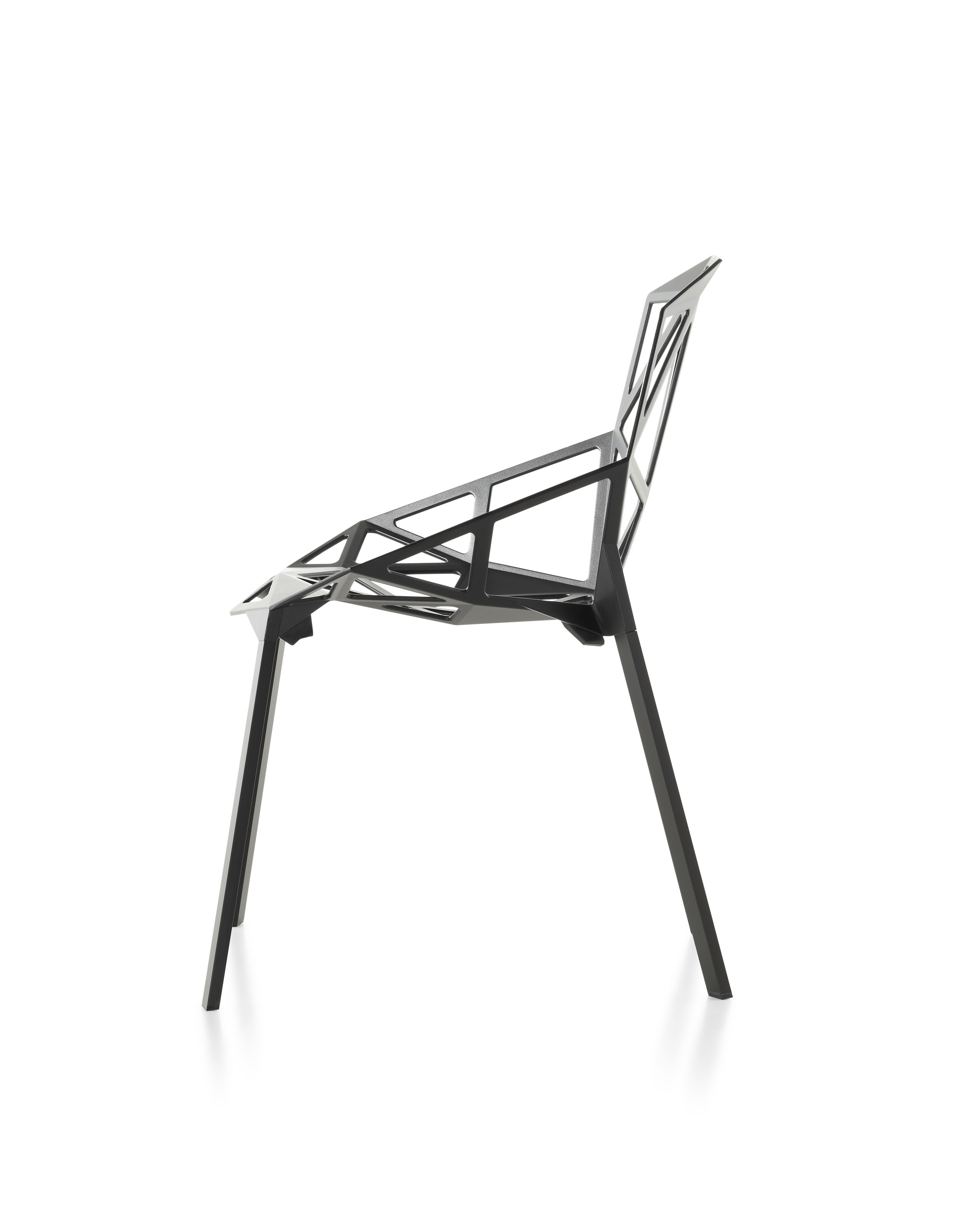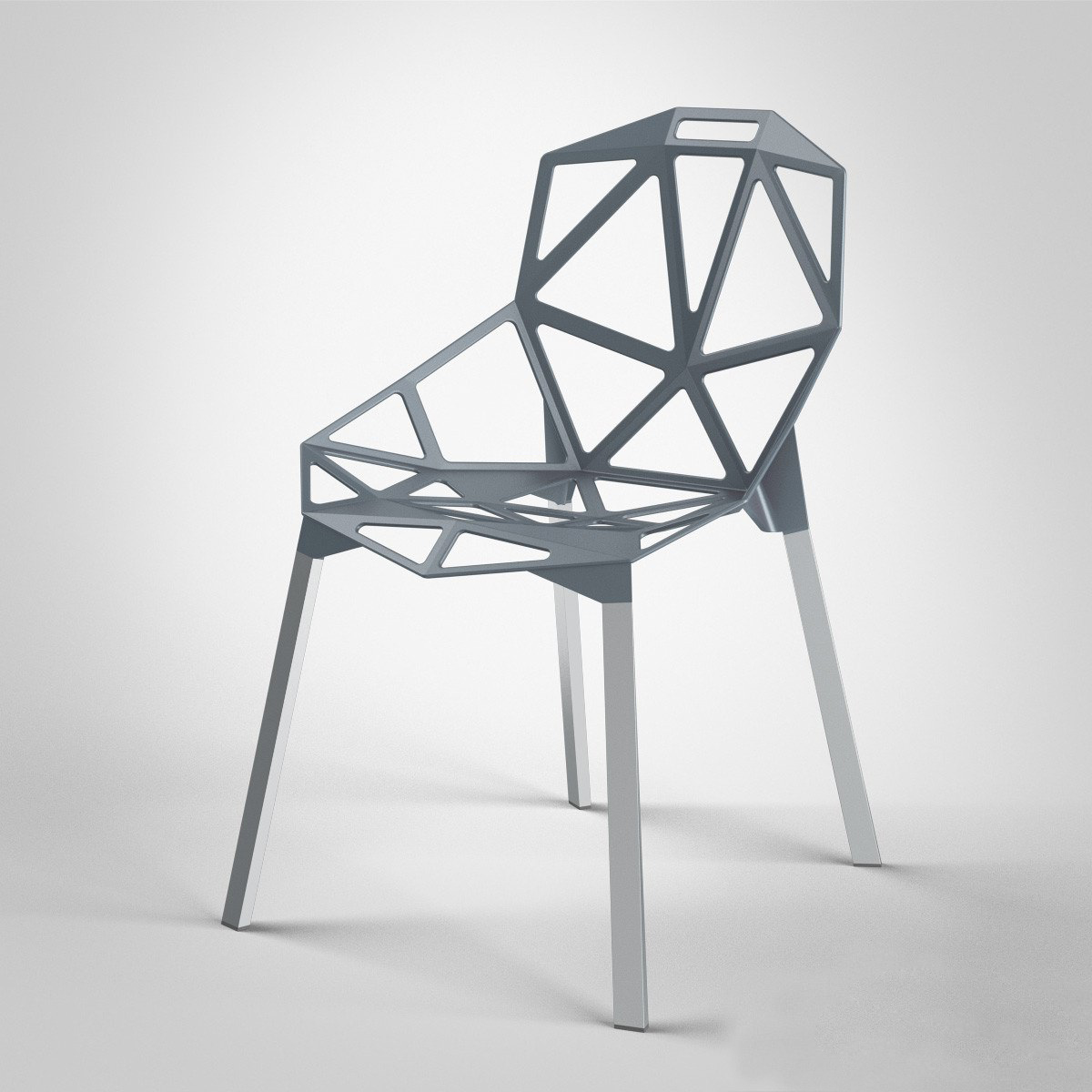 最受瞩目的德国设计师Konstantin Grcic 应邀为MAGIS 设计的Chair One(几何吧椅),是设计生涯中最具有标志的产品之一。办公椅体为模铸铝合金结构,经过氟化钛镀膜与塑料粉末涂布。椅子具有阻燃性、抗腐蚀性。适合室内及室外使用。以铝金属与钛金属制成的 Chair One,以多个平面以不同角度组合而成,建立起立体的外型。多个中空的三角型组合而成的座椅,不但令为用家带来强而有力的承托结构,而且还能在简单设计之中带出不一样的风格。这把椅子的惊人形象难免使人对它的舒适度产生疑问,但当你真正坐于其上,你会发现它实际上非常舒适,那些稀疏的网状结构能够极好地支撑不同体型的人体,后背上的把手也非常实用。当你知道Chair-One最初是被当作户外用椅而设计的,你会更加佩服Konstantin Grcic的缜密用心:极少的表面可以杜绝雨水,并且减少灰尘堆积,夸张的形态则令它能够在街道、建筑或自然的环境中拥有自己美学上的存在,而不是被环境所吞没。Konstantin Grcic花了三年时间设计Chair One,自2003年诞生以来,堪称Grcic精简主义风格的代表作。2006年,Chiar One为Konstantin Grcic赢得了德国政府的设计大奖。