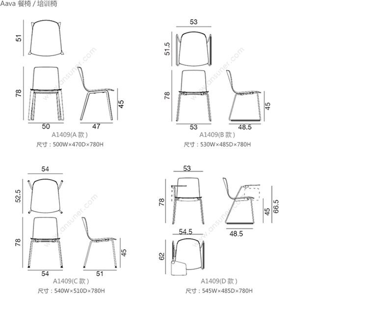 Aava 餐椅/培训椅 系列尺寸/示意图