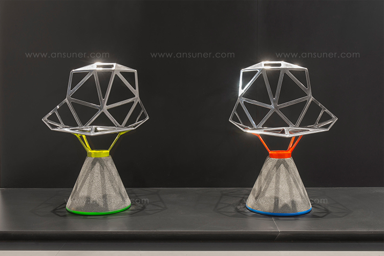 最受瞩目的德国设计师Konstantin Grcic 应邀为MAGIS 设计的Chair One(几何吧椅),是设计生涯中最具有标志的产品之一。办公椅体为模铸铝合金结构,经过氟化钛镀膜与塑料粉末涂布。椅子具有阻燃性、抗腐蚀性。适合室内及室外使用。以铝金属与钛金属制成的 Chair One,以多个平面以不同角度组合而成,建立起立体的外型。多个中空的三角型组合而成的座椅,不但令为用家带来强而有力的承托结构,而且还能在简单设计之中带出不一样的风格。这把椅子的惊人形象难免使人对它的舒适度产生疑问,但当你真正坐于其上,你会发现它实际上非常舒适,那些稀疏的网状结构能够极好地支撑不同体型的人体,后背上的把手也非常实用。当你知道Chair-One最初是被当作户外用椅而设计的,你会更加佩服Konstantin Grcic的缜密用心:极少的表面可以杜绝雨水,并且减少灰尘堆积,夸张的形态则令它能够在街道、建筑或自然的环境中拥有自己美学上的存在,而不是被环境所吞没。Konstantin Grcic花了三年时间设计Chair One,自2003年诞生以来,堪称Grcic精简主义风格的代表作。2006年,Chiar One为Konstantin Grcic赢得了德国政府的设计大奖。