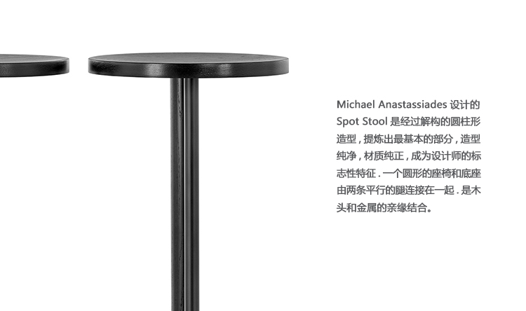 一个解构圆柱形形状提炼到其裸露的必需品, 由迈克尔 Anastassiades 设计的专凳有一个纯度的形式和诚实的材料, 已成为设计师的签名。一个圆形的座椅和底座由两个平行的腿在木和金属的亲属配对举行。