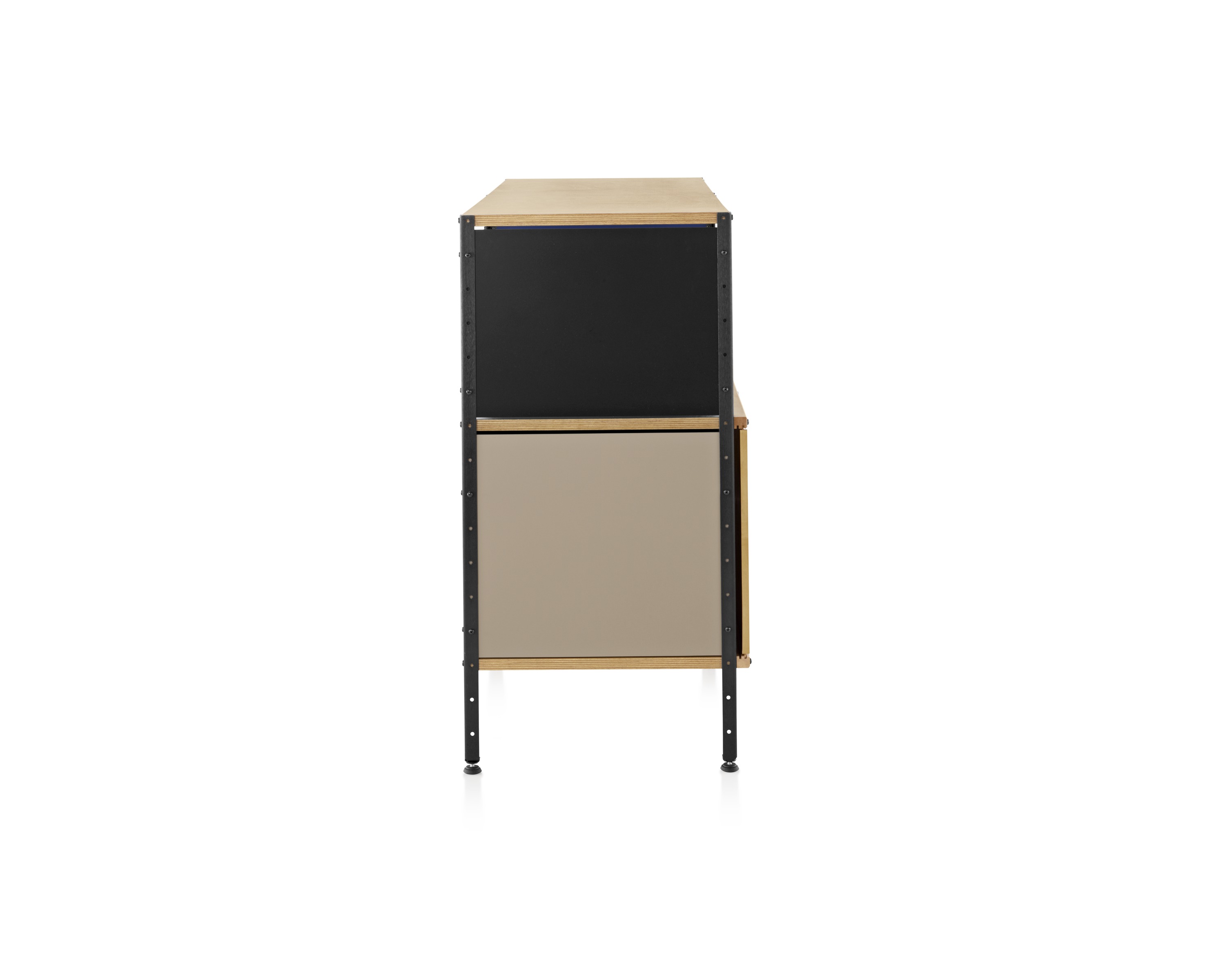 Eames存储单元由五种配置和四种大小的箱子、橱柜和抽屉组成。立柱、交叉支撑板和穿孔板要么是镀锌的,要么是黑色的;橱柜的正面是凹凸不平的胶合板;抽屉的正面和架子是模制的胶合板;箱体侧面和背面的面板是涂硬木的。可供您选择两种配色方案:中性色或亮色。