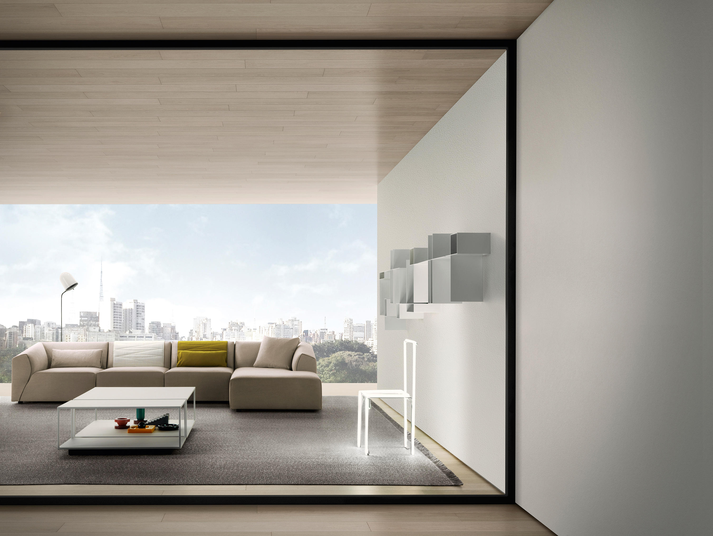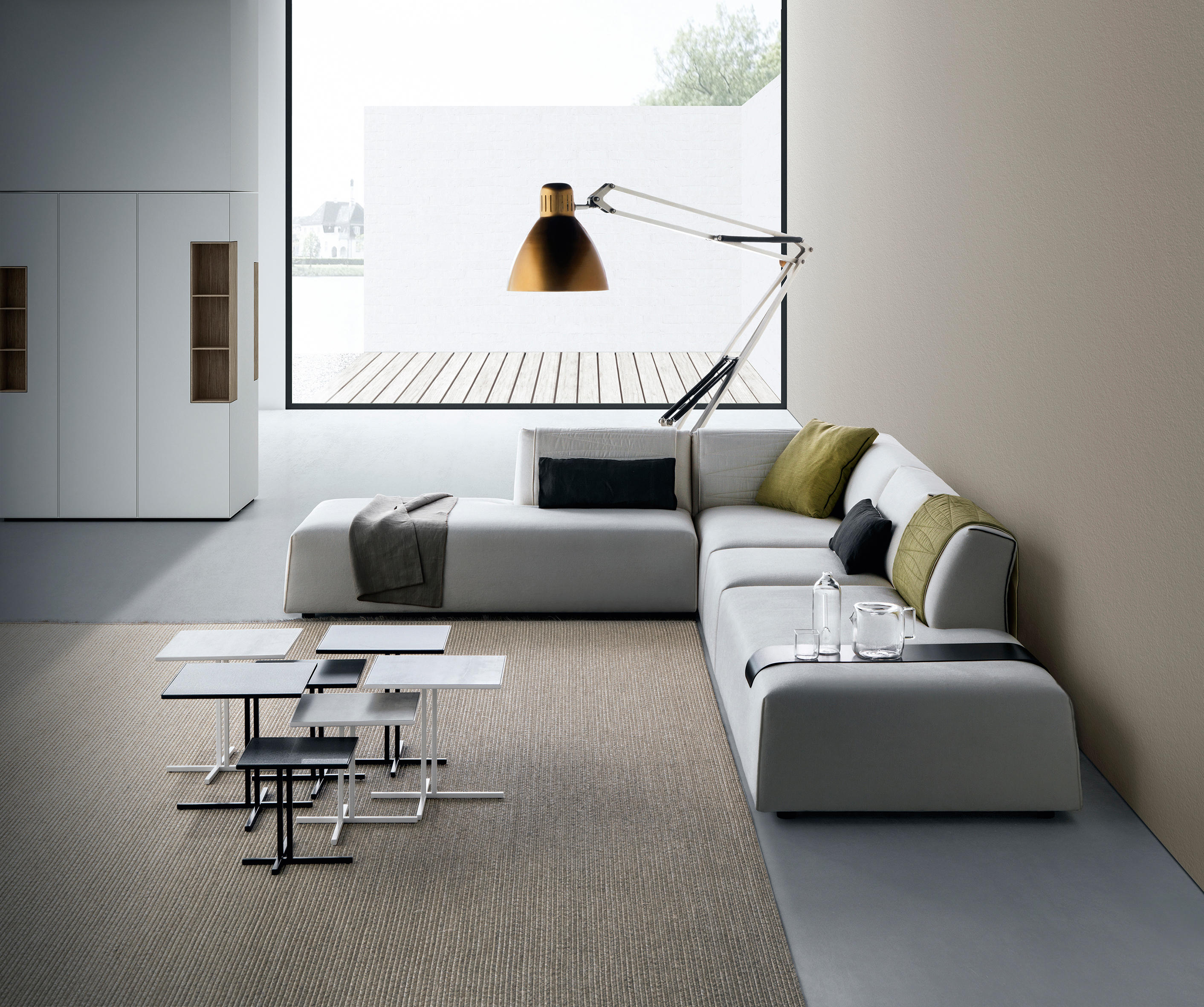 Thea是新的软垫系统,源自女性对形状的解释以及明显对立的指导原则之间的平衡:舒适,舒适-整洁,动态-严格,轻巧-高度紧凑。Thea的折衷主义在于对不同观点的和谐研究:正面正交,侧面倾斜和背面凹入。沙发具有高度的原创性和动感,只是因为它融合了所有这些语言:它是一种投射和形状的游戏,赋予其设计独特且可识别的标志。涂层增强了女人味:就像包裹包裹和垂褶的连衣裙一样,褶皱完美地粘在模块的形状上。通过使用不同的接缝,对剪裁细节以及意大利剪裁的要求给予特别关注。在三种不同的颜色(白色,鸽子灰色和无烟煤灰色)中应用偏斜接缝和对比度磨边,以定义角度,曲线和形状。五个功能性配件完善了产品系列:头枕,靠垫,方形垫子,被子和铝制托盘。