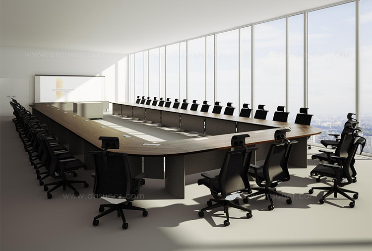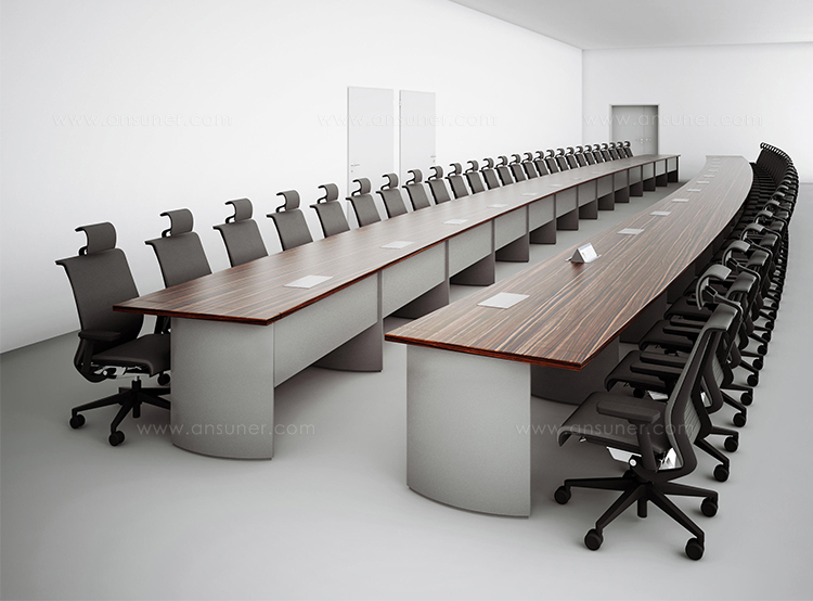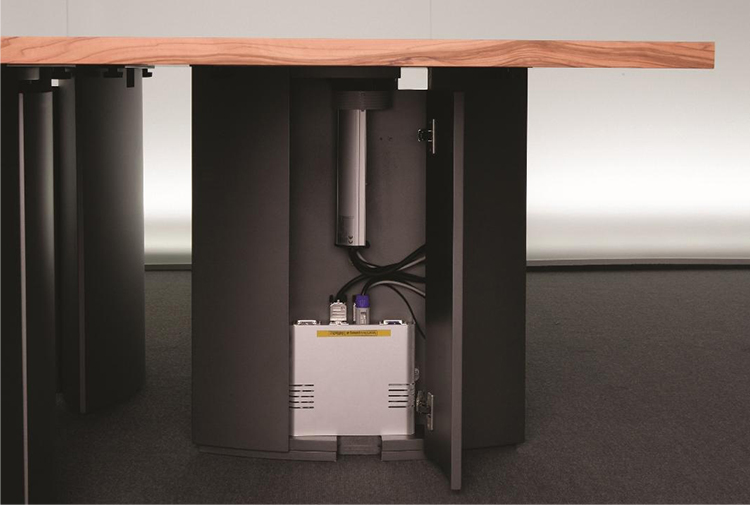灵活的可变型会议桌系统,看上去像是固定安装的会议桌,且非常稳固。椭圆形的桌腿无需借助任何工具可在短时间内轻松组装和拆卸。32mm厚的桌面、可根据客户需要定制其形状和大小。椭圆形的桌腿可隐藏技术集成和走线系统。