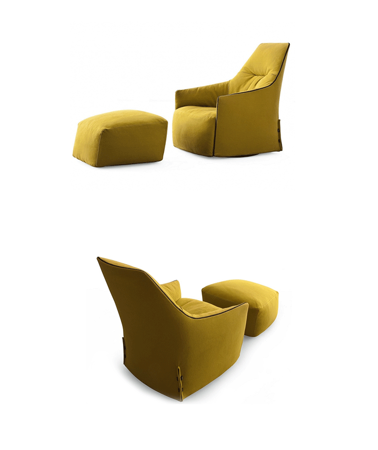 "The Santa Monica Lounge armchair,characterized by a unique design,is a project conceived by the French designer Jean-Marie Massaud,and it is produced by Poliform,a leading company in the made in Italy furniture manufacture.The Santa Monica Lounge armchair on sale in our showroom is matched with the Santa Monica ottoman.Both the items are covered in fabric,yellow colour,with iron coloured stitches."