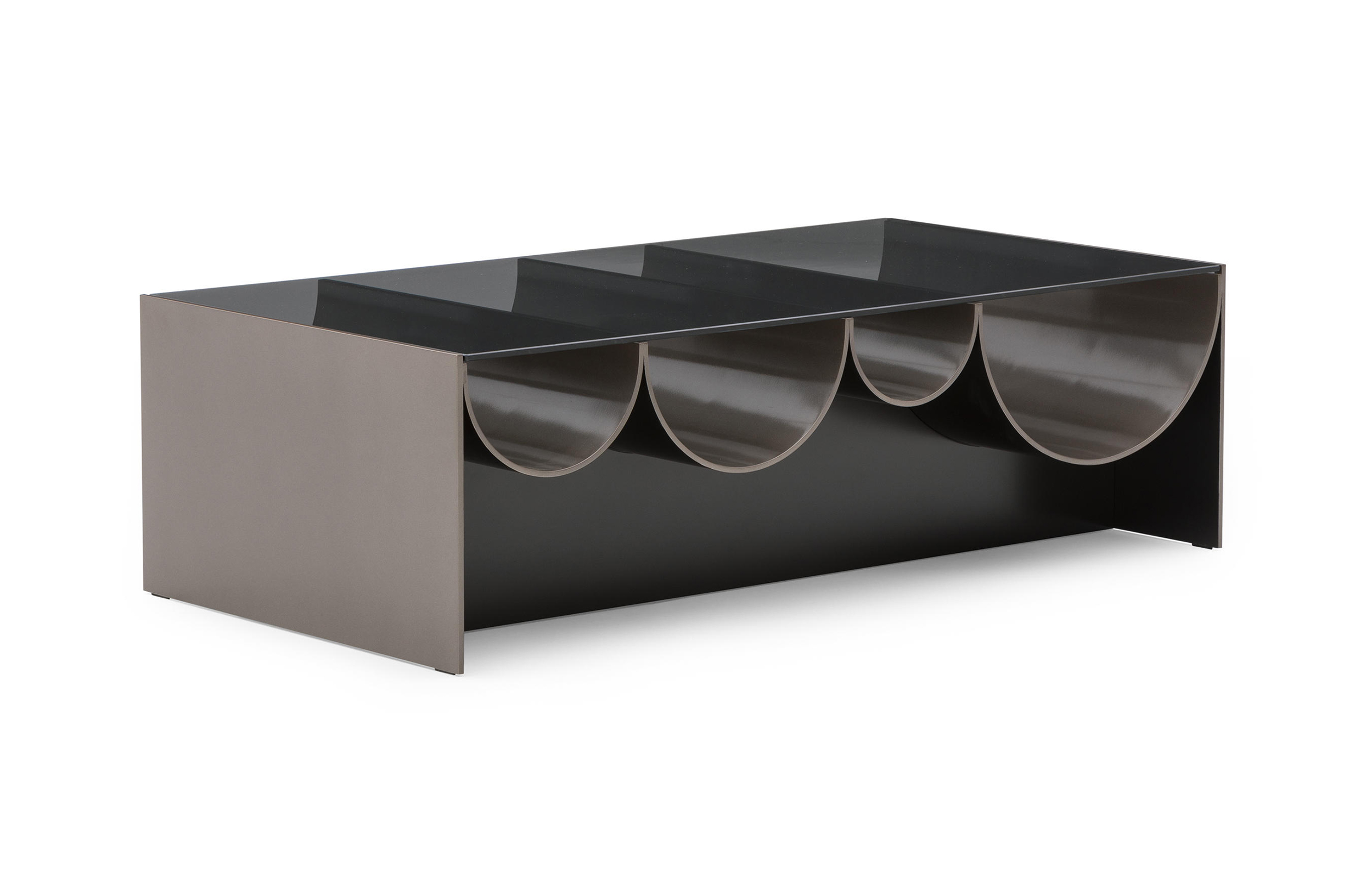 波浪咖啡桌是由一种烟熏的灰色玻璃制成的,它由一种漆成的铝结构支撑着,外面是一种沙子或浅青铜色的色调,里面有一种淡黄色的色调。