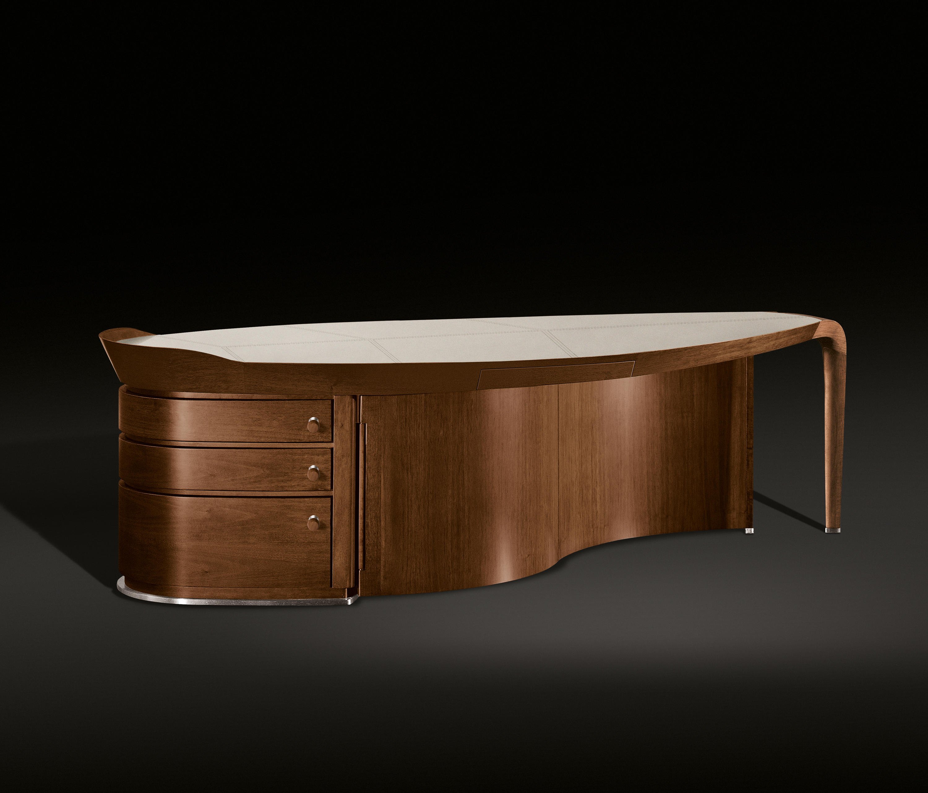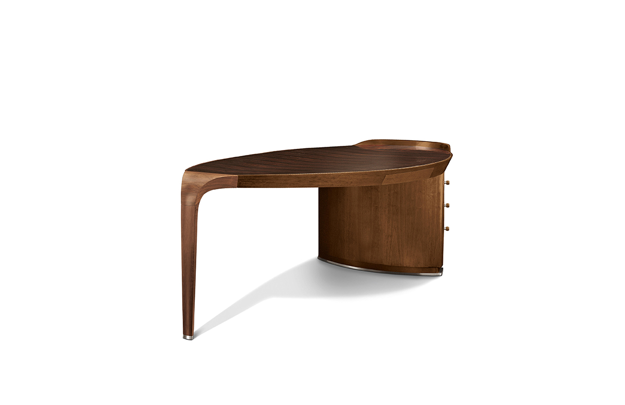 大班台框架,顶部和固体的五斗橱 国家胡桃木单板,可在自然完成,烟草的颜色 完成和黑胡桃木。 腿之间的连接 和腿都在核桃卡纳莱托木与自然完成。