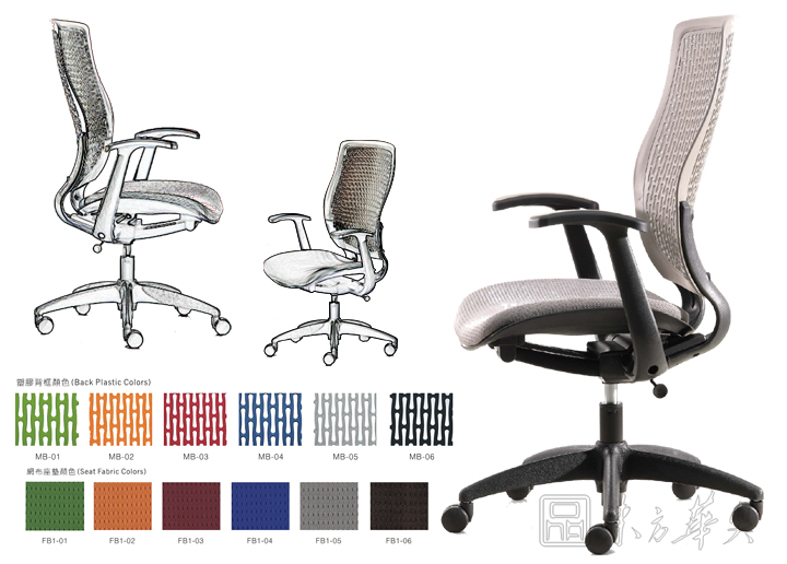 椅背:采用高张力网布,具有透气性强、弹力强及不助燃等特点。背框,靠背,腰靠:采用尼龙塑胶模出,环保,防助燃;材质靭性强并富有弹力,不易脆