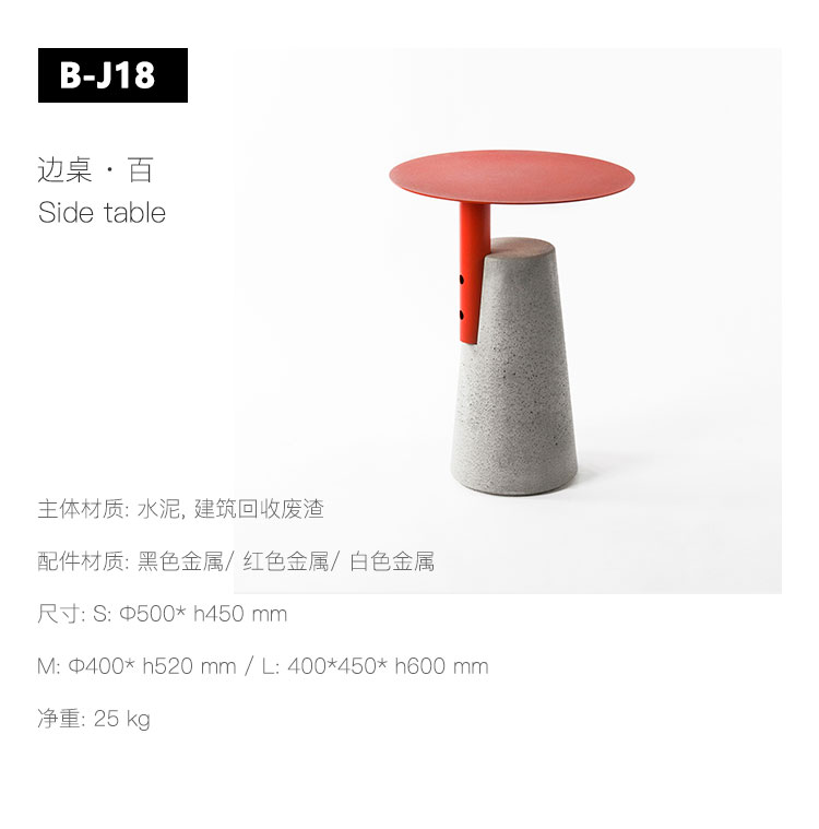 一竖加两竖,加三竖;红色搭黑色,搭白色,所见即所得,简单就是法则。用“0”形金属面板与水泥墩做一道减法,生产工序至简,功能至简,造型至简。简单才是需求,给设计做笔减法,去除复杂的修饰、多余的功能,凝炼欲望,简化造型,一切只为直白的使用与纯粹的美。在加工和组装工序上的简化,能有效节省生产成本。作为边桌,具有很强的功能性目的,贴合现代居室的简约理念,没有过多的干扰性,适用于现代家居用具的各种组合搭配。