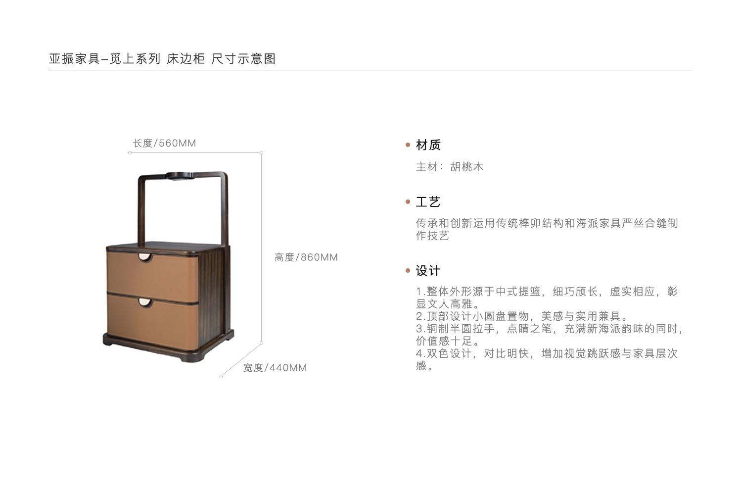 1.整体外形源于中式提篮,细巧颀长,虚实相应,彰显文人高雅。 2.顶部设计小圆盘置物,美感与实用兼具。 3.铜制半圆拉手,点睛之笔,充满新海派韵味的同时,价值感十足。 4.双色设计,对比明快,增加视觉跳跃感与家具层次感。