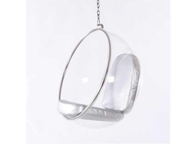 "芬兰家具设计大师艾洛.阿尼奥(Eero Aarnio)在德国品牌Adelta的代表作Bubble Chair(泡泡椅)。灵感来自于Ball Chair,但尺寸略小,而且椅子是以压克力制成,光线可以从四面八方透进。压克力加热充气,使它成为皂泡状,加入一个钢圈和椅垫即成。这样一组貌似轻巧的家具,但却能负重至少200公斤以上,由天花板垂链将Bubble吊起,宛如漂浮于空气中的泡泡一般!洁净面透明!带着科技感的椅子,又像置身于太空中,未来感十足。摆脱了椅子就是要放在地板上的刻板印象。最适合为摄影背景之用。坐在这把椅子上,即使身处一个拥挤的空间,也有点遗世独立的奇妙感觉。挪威一家电话公司在总公司入口大厅吊了几把这样的椅子,让客户可以在打行动电话时,有个宁静的空间。这件作品在1966年的科隆家具博览会上一举成名。