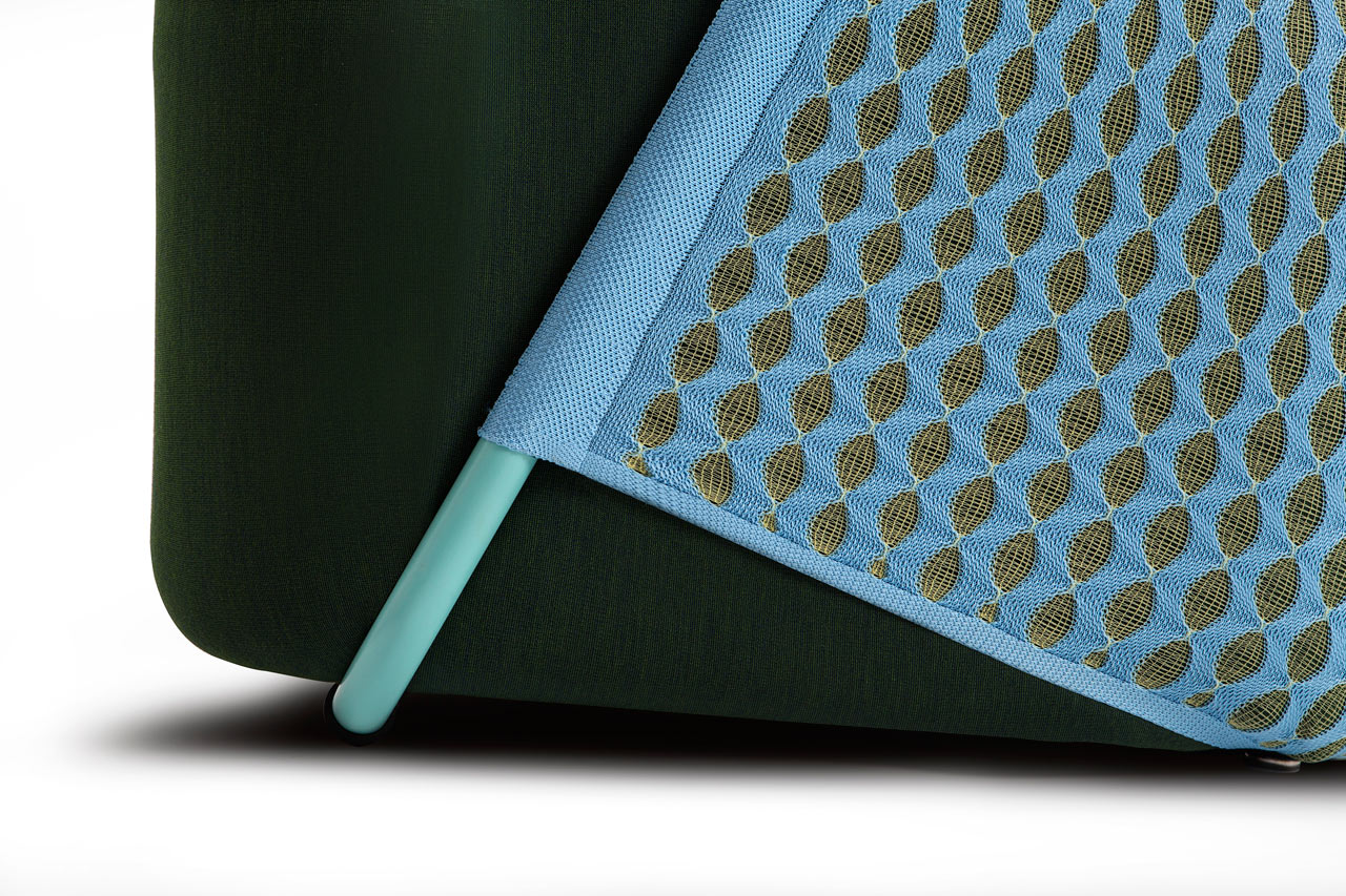“摇篮”是两种类型座位的独特组合;一个网状结构吊床和一个传统的软垫沙发椅。扶手椅源于工作室的材料驱动、工艺主导、工业设计方法、网格材料的构建研究,以及传统座椅组件之间的关系研究。“摇床”采用了一种定制的剪裁模式,允许非弹性织物以三维的方式进行。这允许正确的张力,舒适地支持身体和视觉上和身体上减少产品的重量。