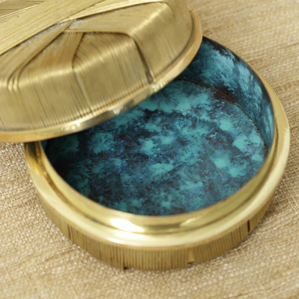 这款黄铜线包裹盒采用洛杉矶手工制作,顶部和底部饰有verde铜绿色细节。 这个盒子是床头柜或梳妆台的完美选择。