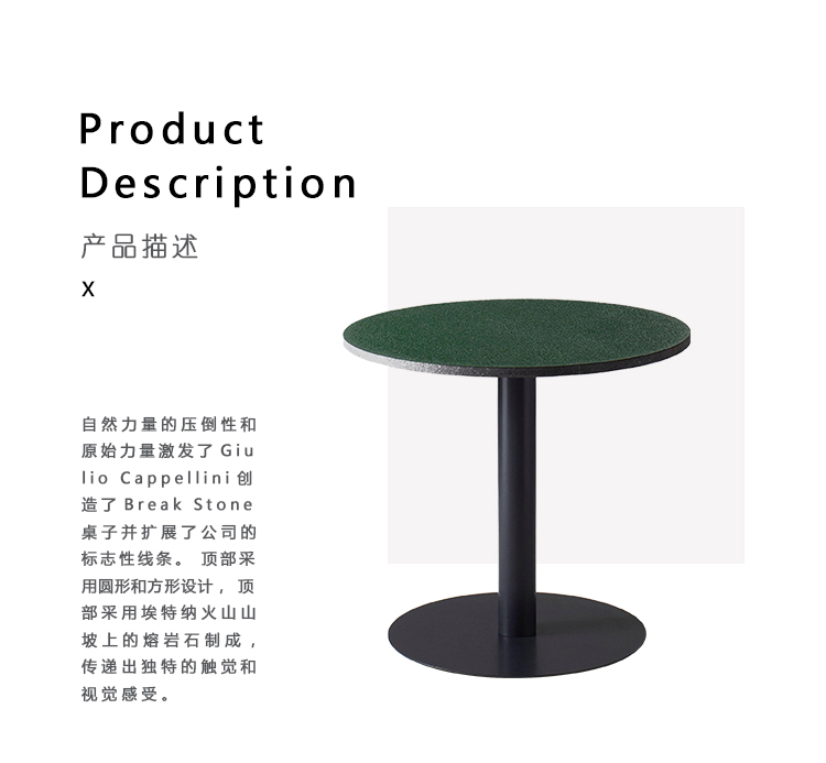 自然力量的压倒性和原始力量激发了Giulio Cappellini创造了Break Stone桌子并扩展了公司的标志性线条。 顶部采用圆形和方形设计,顶部采用埃特纳火山山坡上的熔岩石制成,传递出独特的触觉和视觉感受。 整个生产过程是一个到达材料起源的旅程:顶部首先被送到烤箱重新唤醒熔岩石并将其熔化回岩浆,然后它被塑造成新的形状。 通过熔岩与绿色,蓝色或栗色颜料的融合以及它们的天然玻璃化来实现精加工。 黑色漆钢的基础结构。