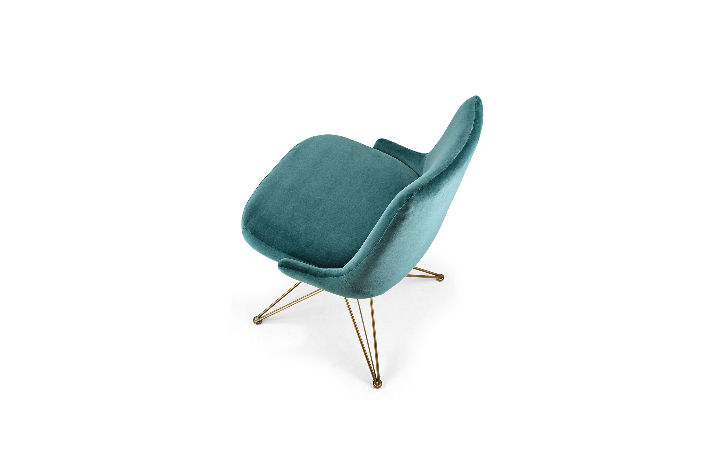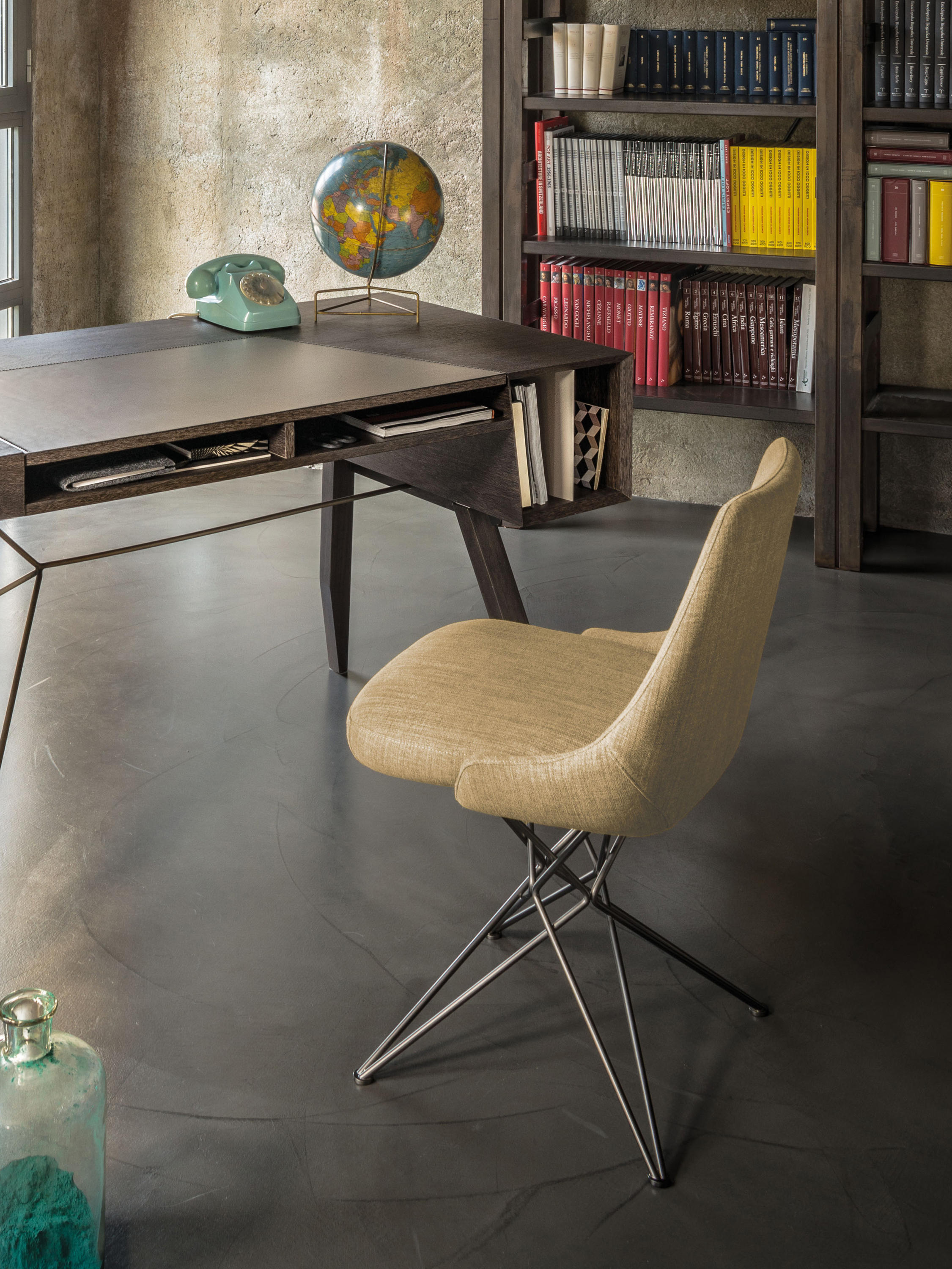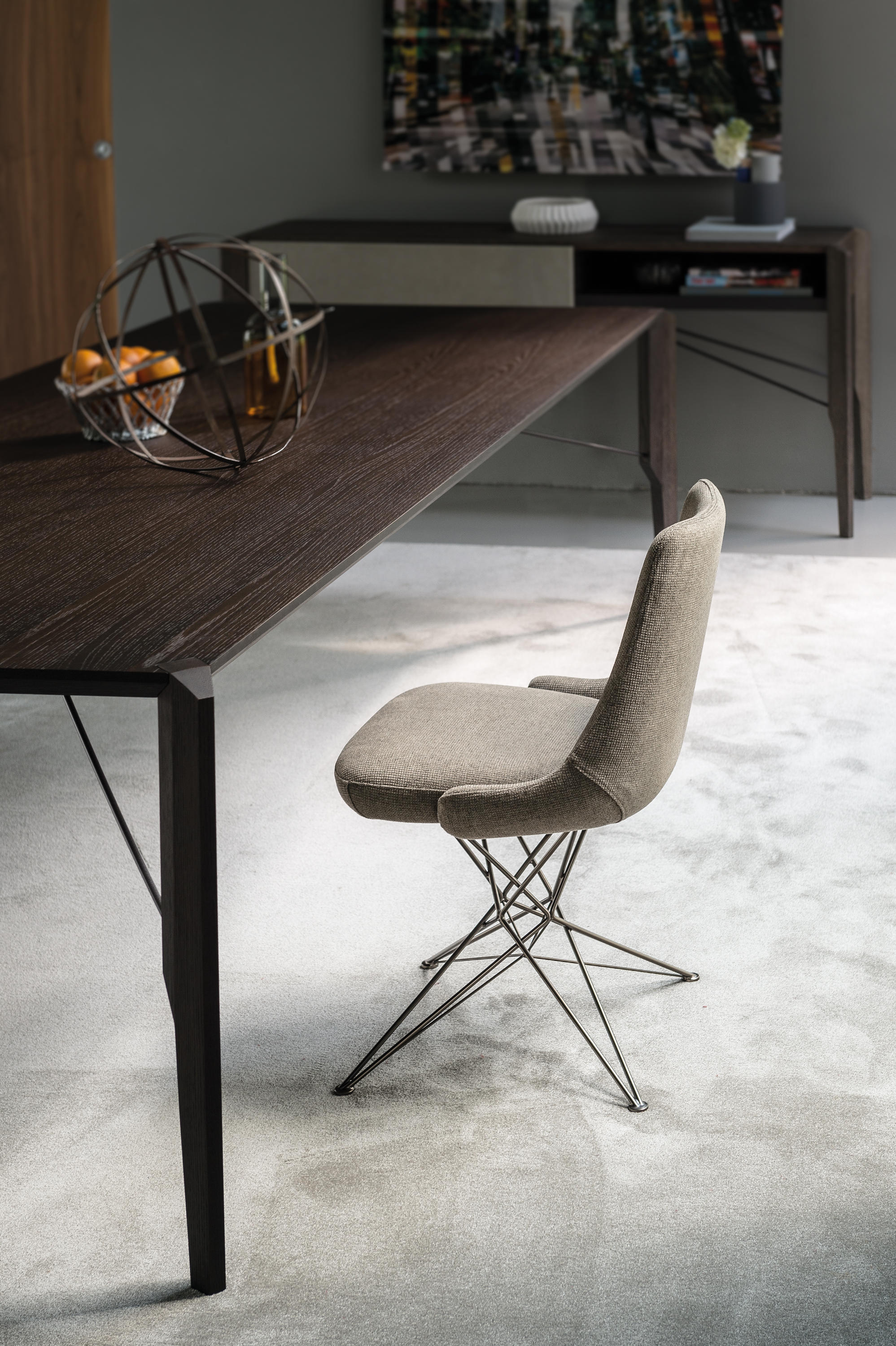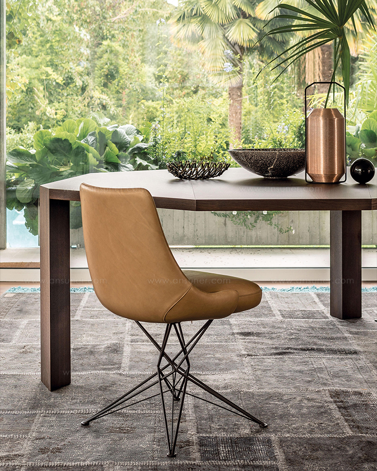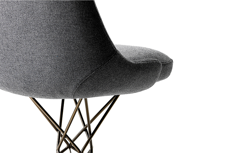 由金属丝制成的轻盈而立体腿部与座椅靠背的结构形成对比,从而在形状和体积之间营造出一种和谐的平衡效果。座椅靠背略微弯曲,将座椅的衬垫包裹起来,以符合人体工程学和动态舒适性。