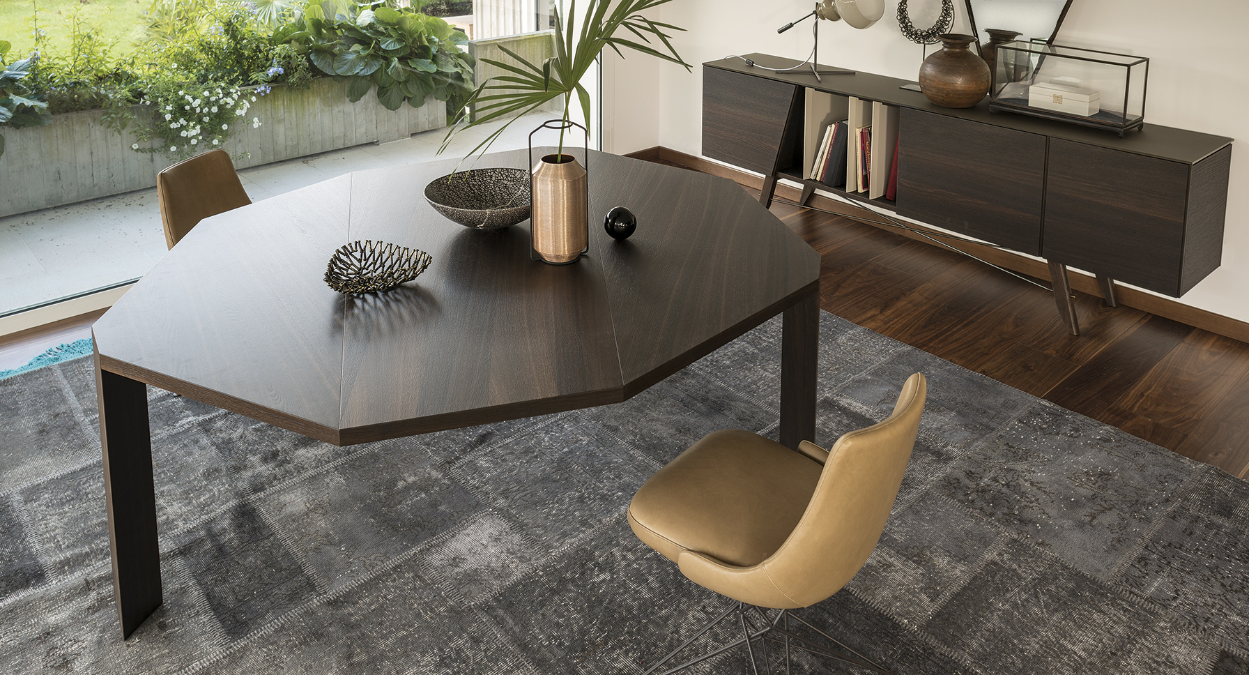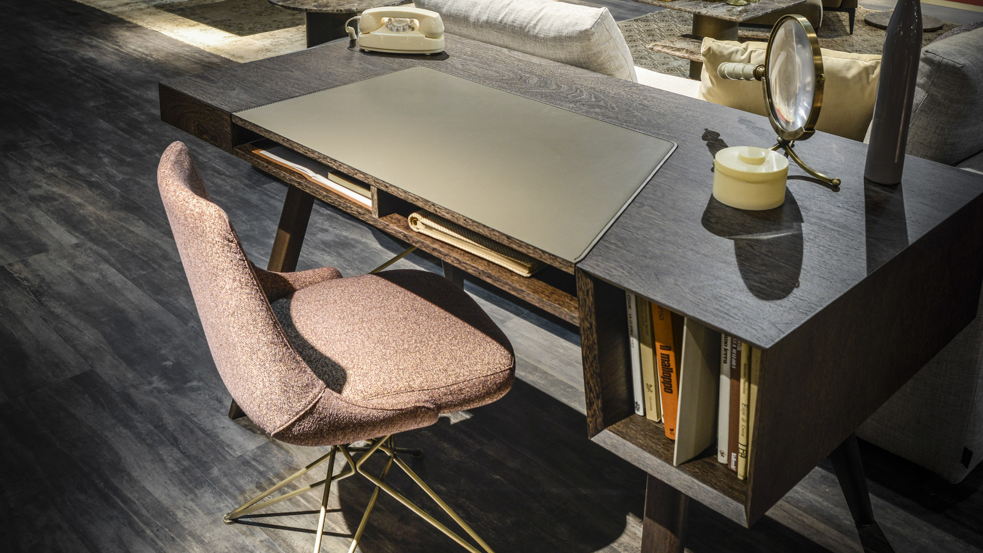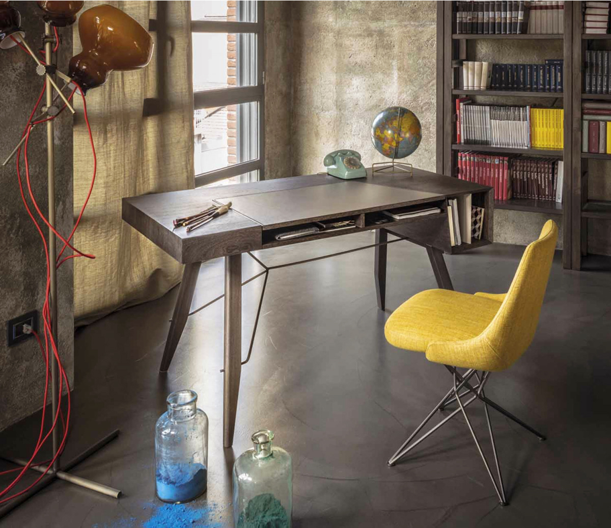 由金属丝制成的轻盈而立体腿部与座椅靠背的结构形成对比,从而在形状和体积之间营造出一种和谐的平衡效果。座椅靠背略微弯曲,将座椅的衬垫包裹起来,以符合人体工程学和动态舒适性。