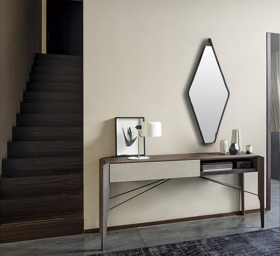 Manzoni & Tapinassi装饰柜的侧板可以在摩卡橡木、卡纳莱托胡桃木或苏皮亚木上选择制作,金属框架由云母褐色或镀锌钛制成。虽然它的结构看起来很薄,却起到了很好的支撑作用。