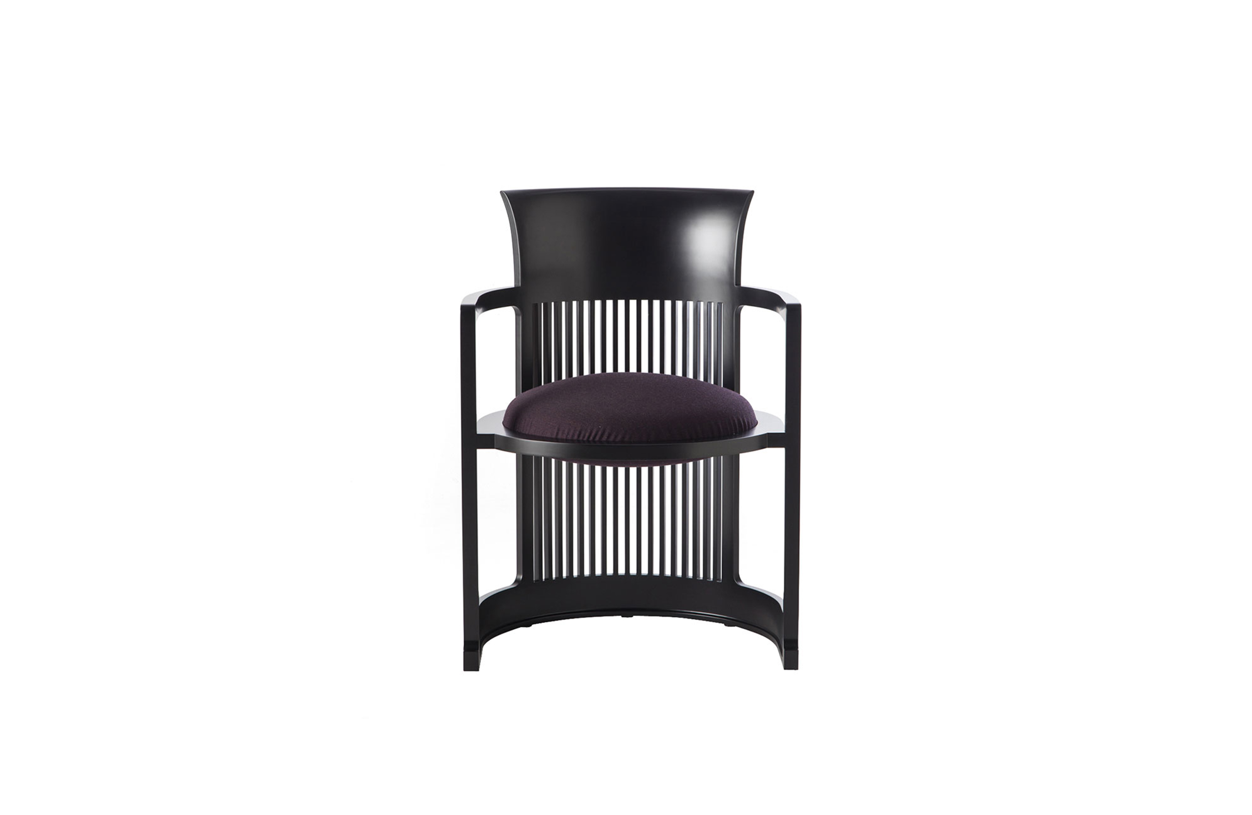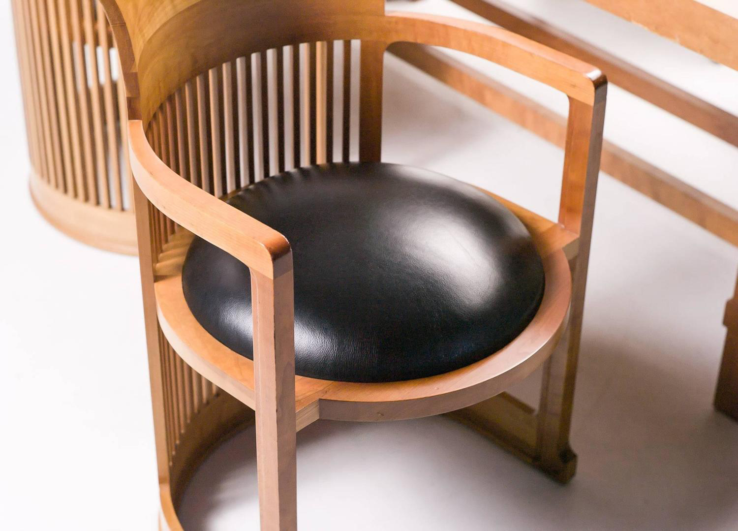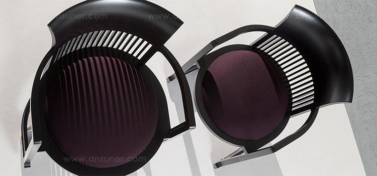 曲背餐椅,采用天然樱桃木、樱桃木色或黑色的胡桃木制造。塑料座面采用聚氨酯海绵和喷胶棉填充。座面软包为皮革或布艺面料。