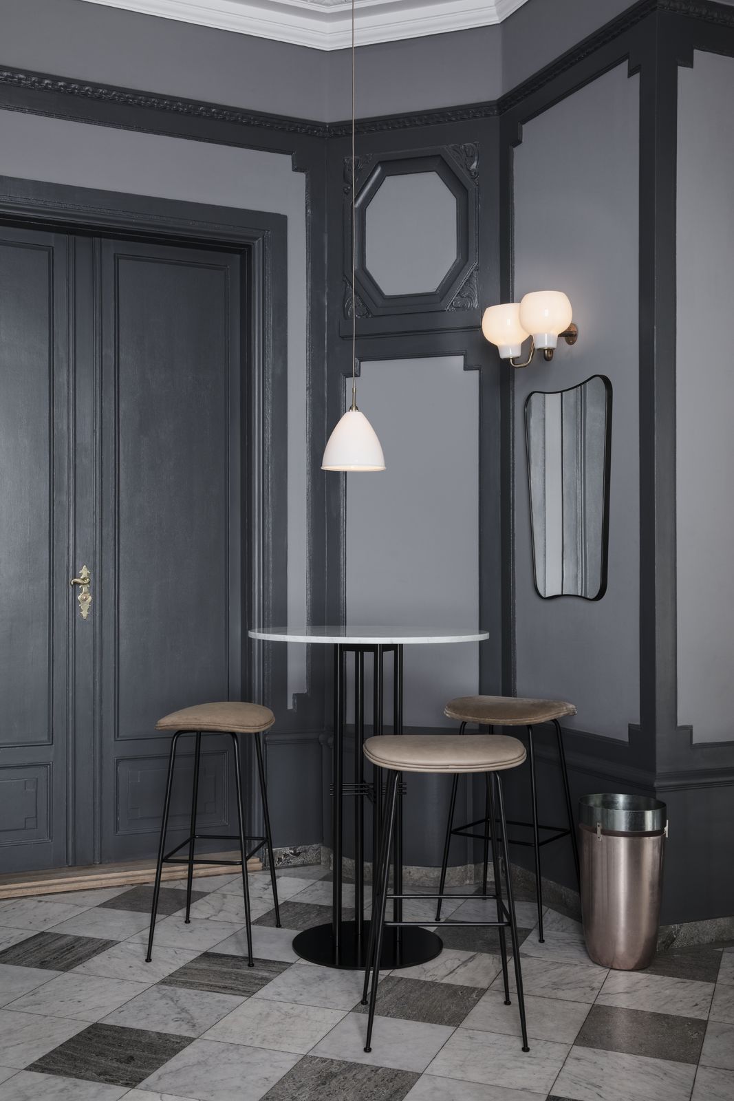 TS圆柱桌三个高度,其特征是细长的金属腿和交叉细节,统一到中心柱,专为巴黎Maison du Danemark的Flora Danica餐厅设计的装饰桌。 作为这个宏伟的空间,桌子代表了斯堪的纳维亚极简主义与全球优雅。 TS Column Table为私密用餐,社交和氛围氛围设定了框架,重点放在真实的材料选择和精心制作的工艺上。