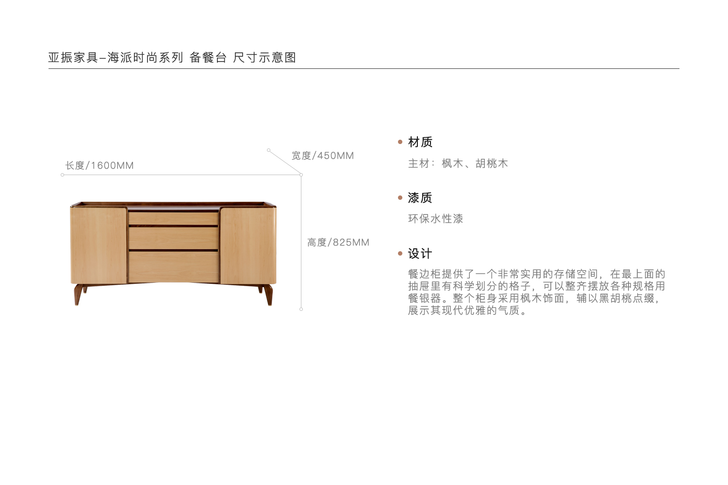 餐边柜提供了一个非常实用的存储空间,在最上面的抽屉里有科学划分的格子,可以整齐摆放各种规格用餐银器。整个柜身采用枫木饰面,辅以黑胡桃点缀,展示其现代优雅的气质。
