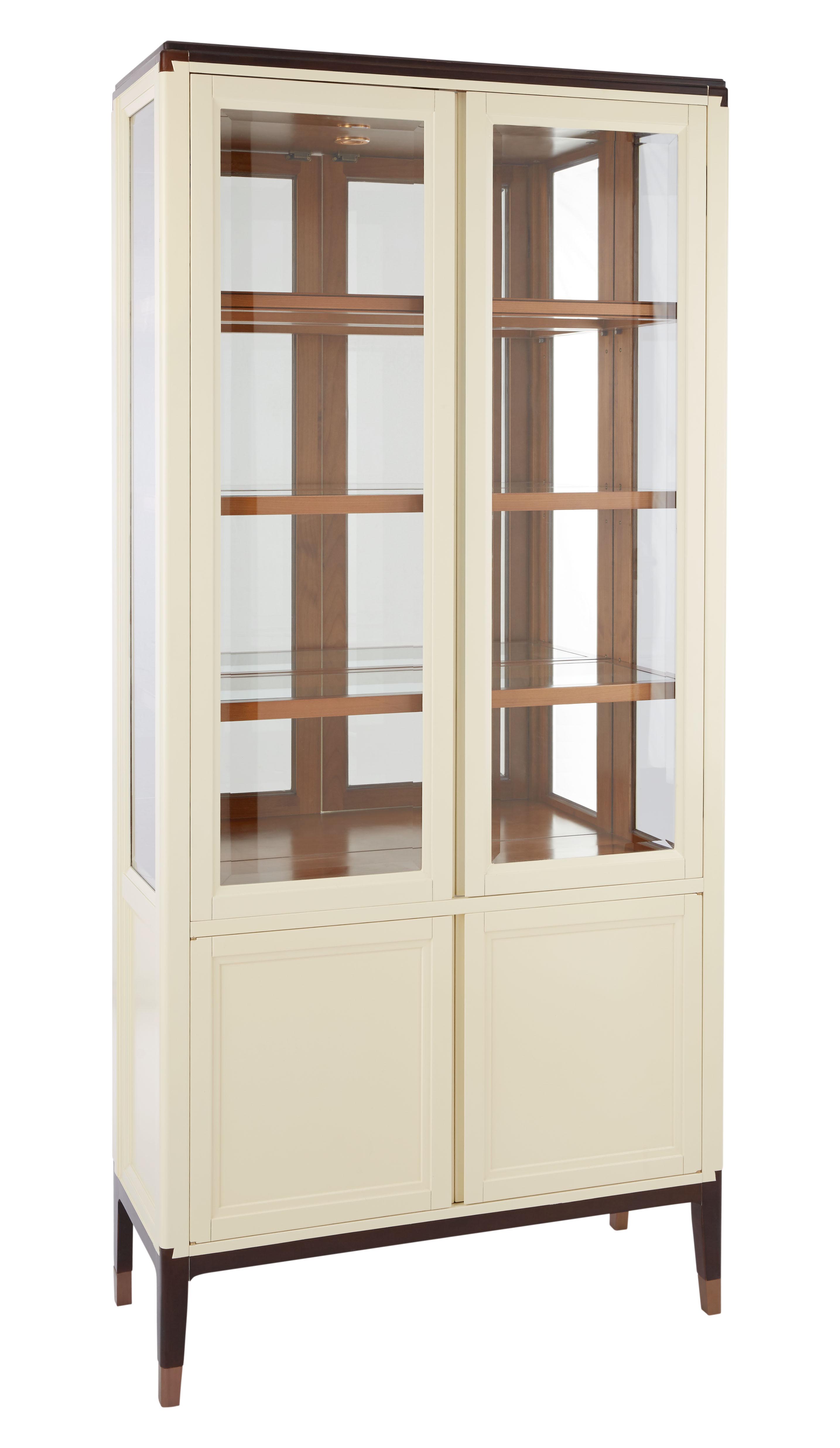 采用燕尾榫造型的拉手,符合成年人手型,不费力即可轻松打开;进口隐藏式铰链;铜脚,赋予中式韵味的同时以防磨损。直线的简洁设计同时满足展示和收纳的功能。