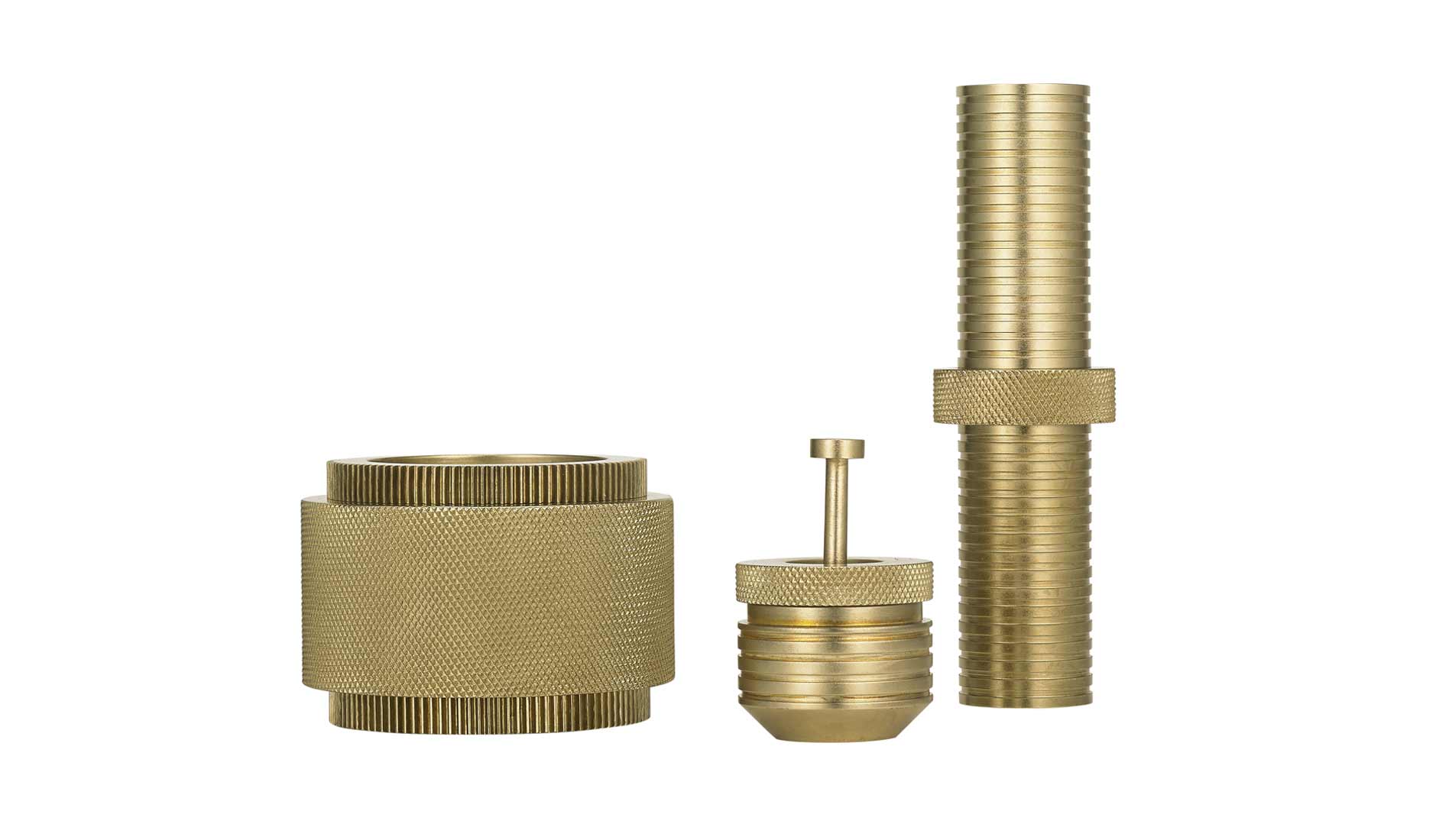 实心铝质生料块和管材在车床上进行加工,使用传统的精密机床进行切削和滚花。然后进行抛光,镀铜和抛光,最后用漆完成。标志深深地刻在底座上。