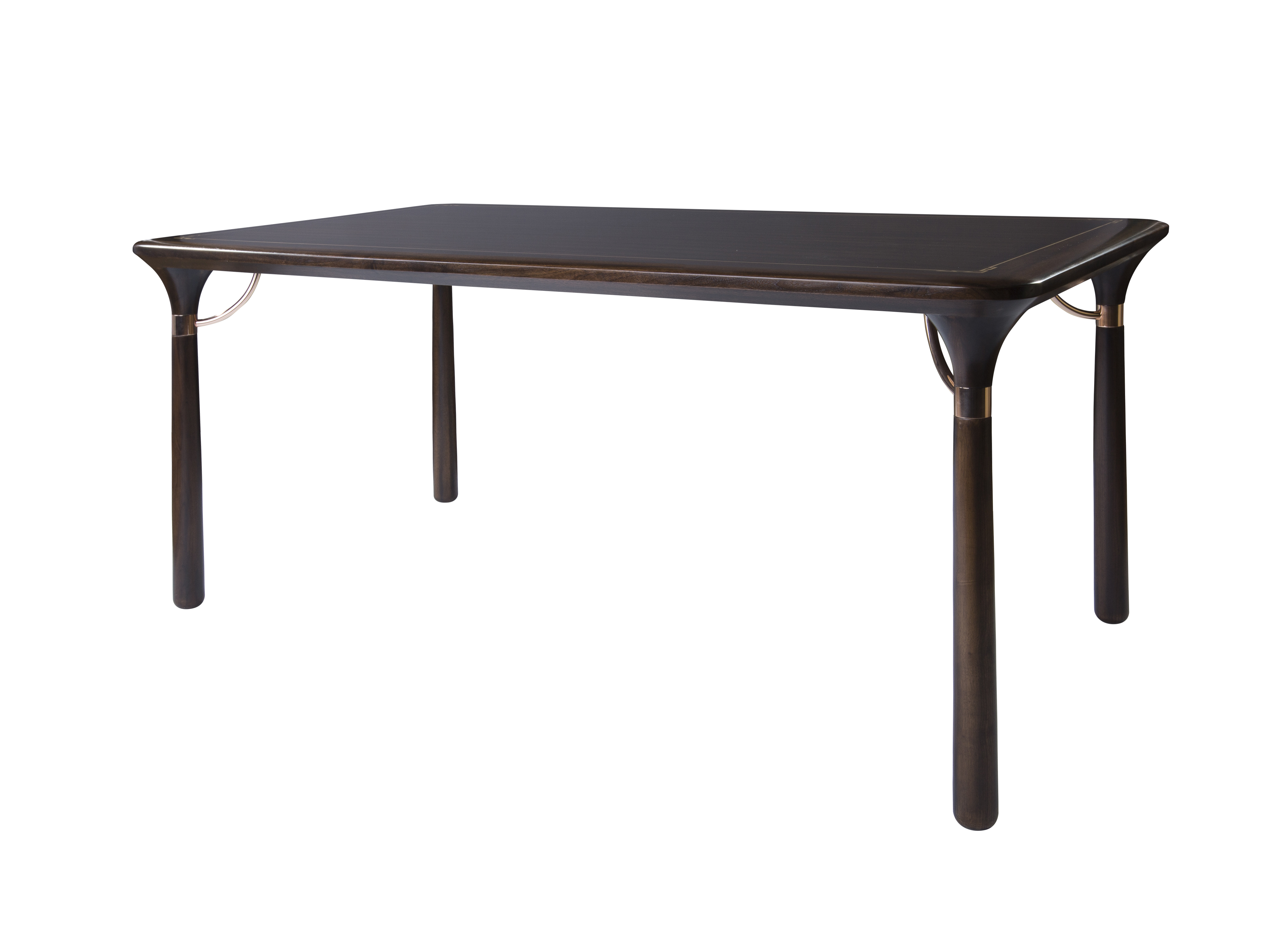 1.餐台造型简洁精巧,源于明式家具形制,以线为主,通透灵动。 2.餐台四角采用中式传统家具中霸王枨造型,同时以铜制装饰,稳固大方,美观典雅。