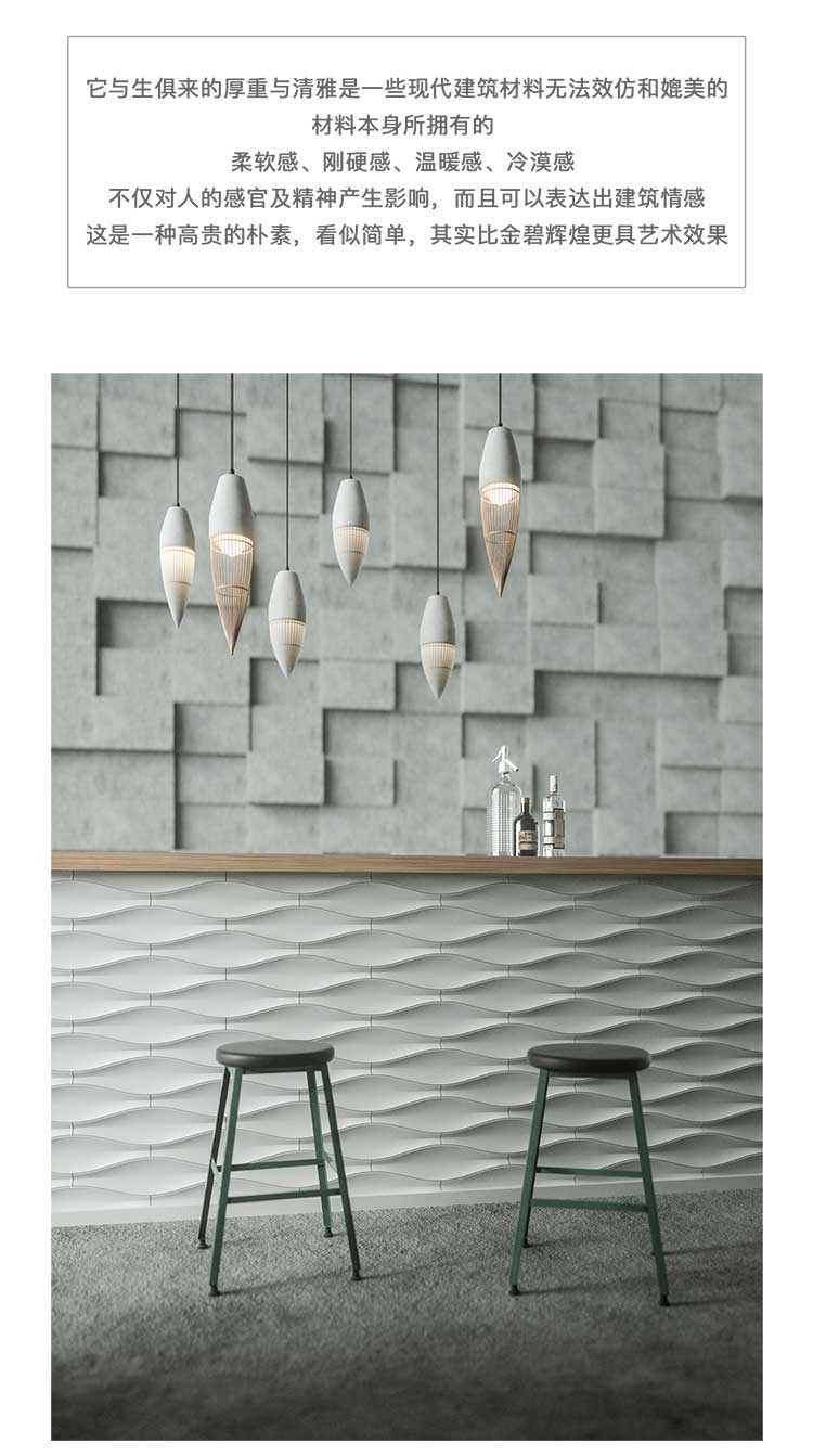 它与生俱来的厚重与清雅是一些现代建筑材料无法效仿和媲美的材料本身所拥有的柔软感、刚硬感、温暖感、冷漠感不仅对人的感官及精神产生影晌,而且可以表达出建筑情感这是一种高贵的朴素,看似简单,其实比金碧辉煌更具艺术效果。