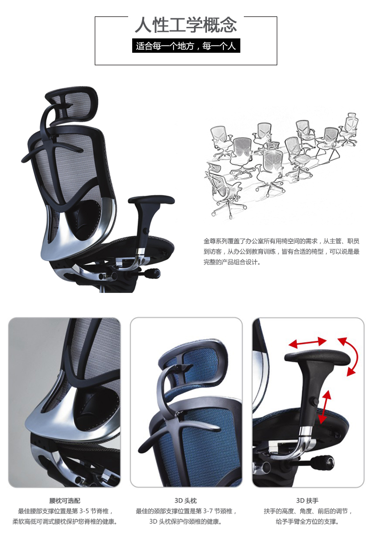 金尊系列覆盖了办公室所有用椅空间的需求,从主管、职员到访客,从办公到教育训练,皆有合适的椅型,可以说是最完整的产品组合设计