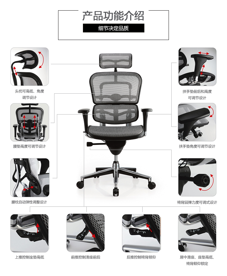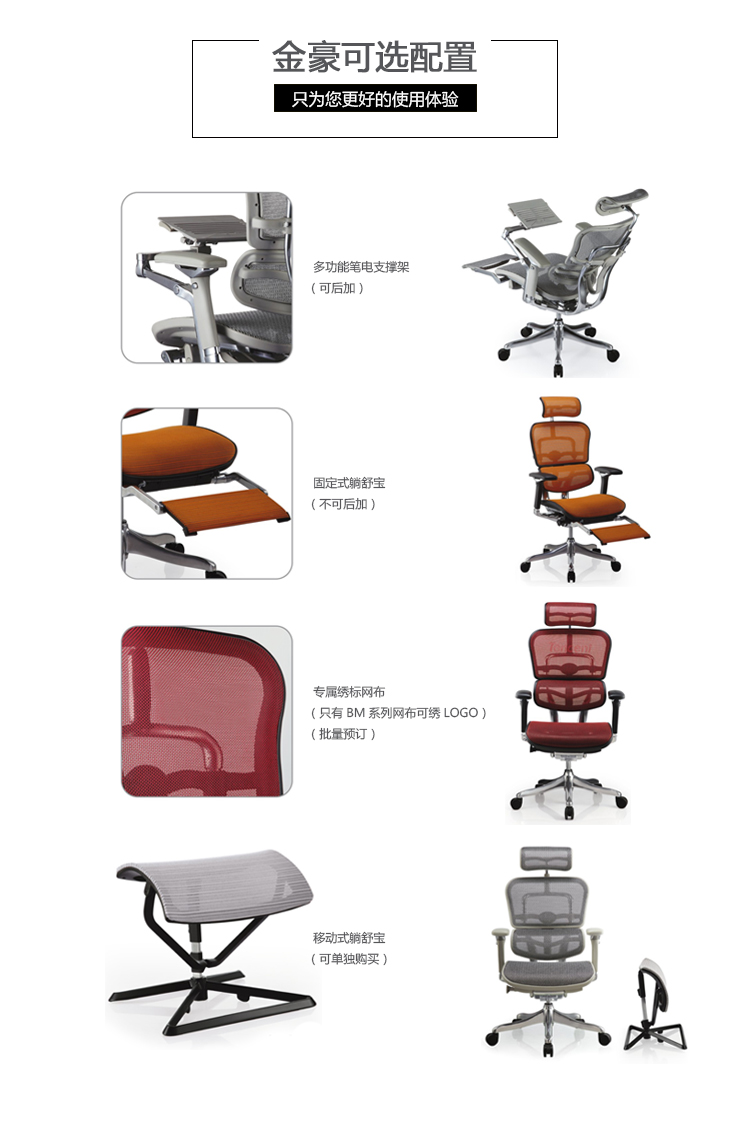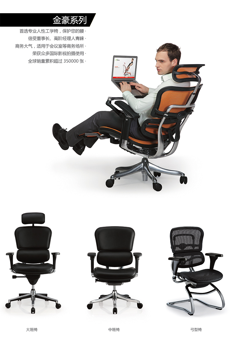 金豪系列采用完全性多功能调整设计,从头枕、椅背、扶手与座垫可进行全方位的调整
