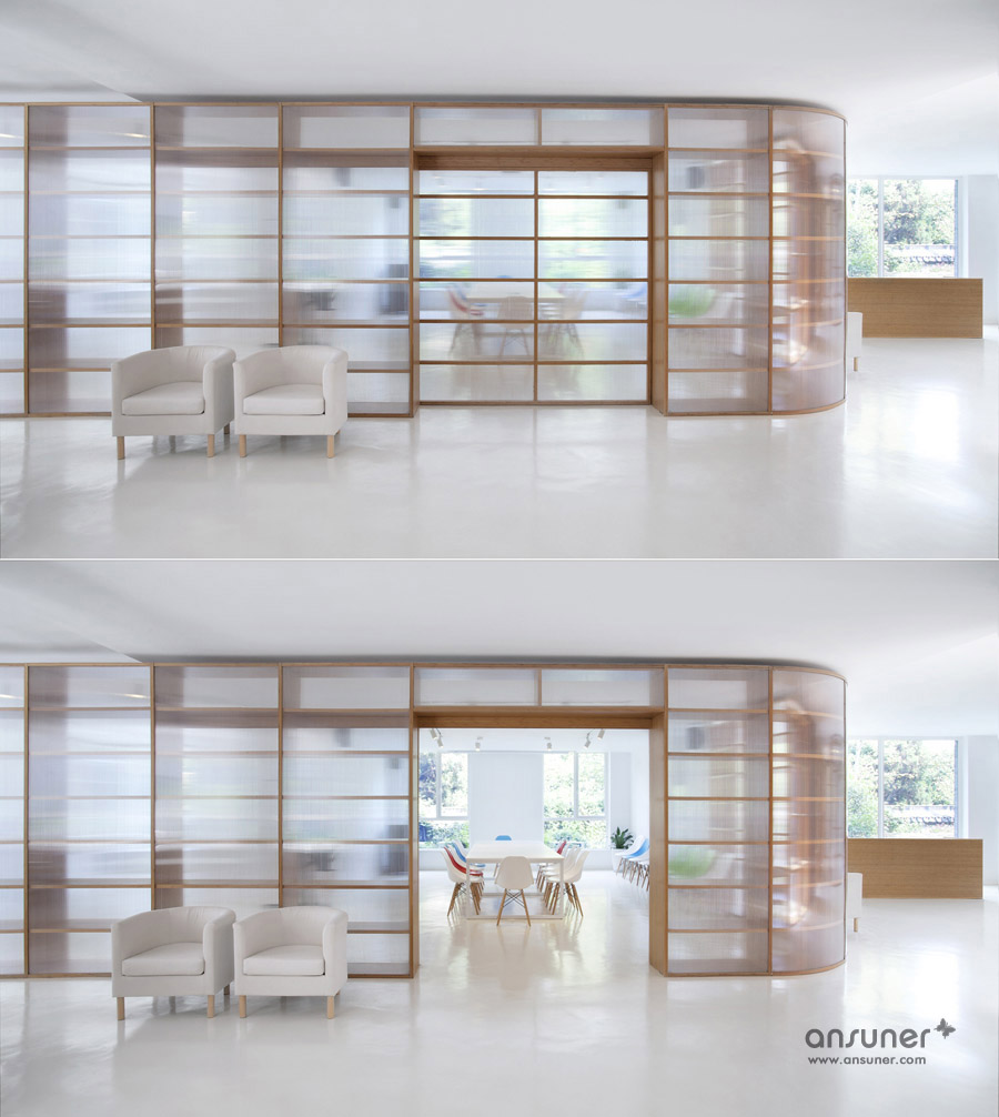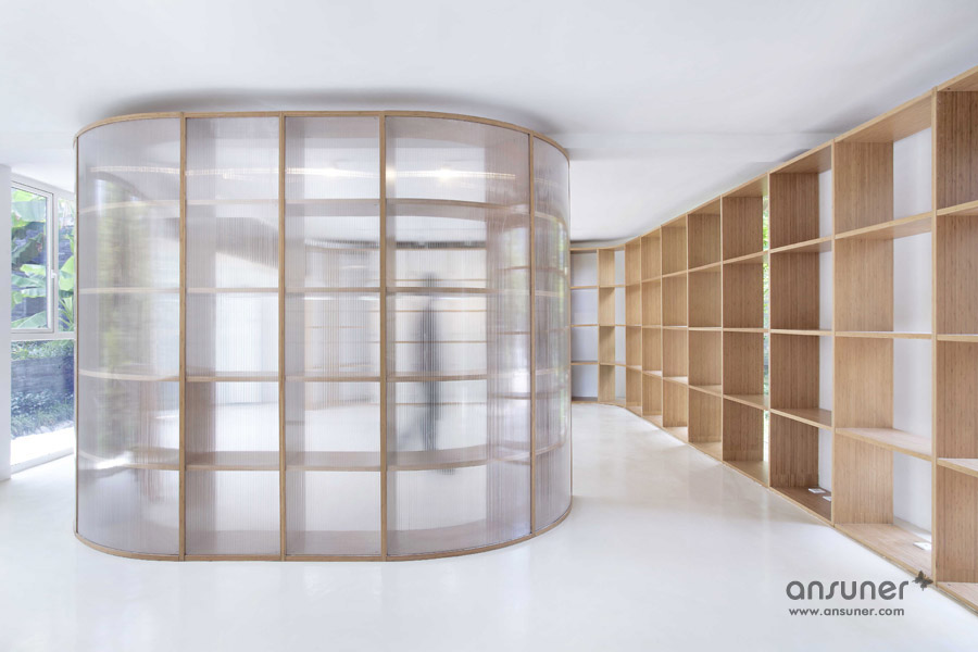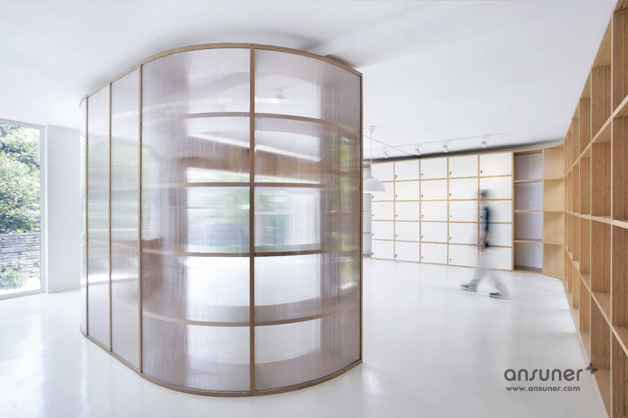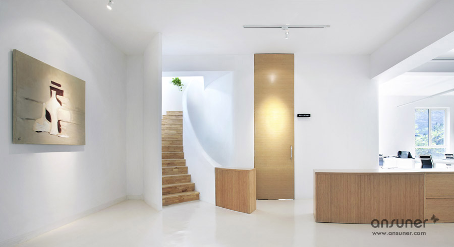 该办公室内装设计项目位于浙江省杭州,虽然基地拥有良好的室外自然景观条件,但原有建筑内部阴暗压抑:已有结构的1层层高3.3m ,梁下高度2.6m, 空间比例相对低矮;2层空间的高度具有优势,但1,2层的联系较弱,原有建筑的双层特点也并没有展现出来。