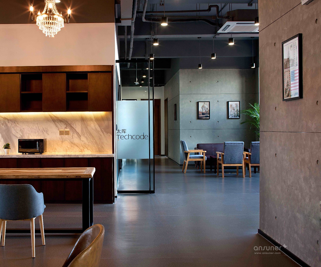 入口处醒目的大红色门厅,墙壁饰面采用集装箱纹理,与接待台后的木色饰面即形成了鲜明对比,同时又烘托出了温暖、开放的环境氛围,独特的工业风格特色让人第一眼就留下深刻印象。铁制的接待台经过特殊锈化处理,展现出了斑驳仿旧的视觉效果。