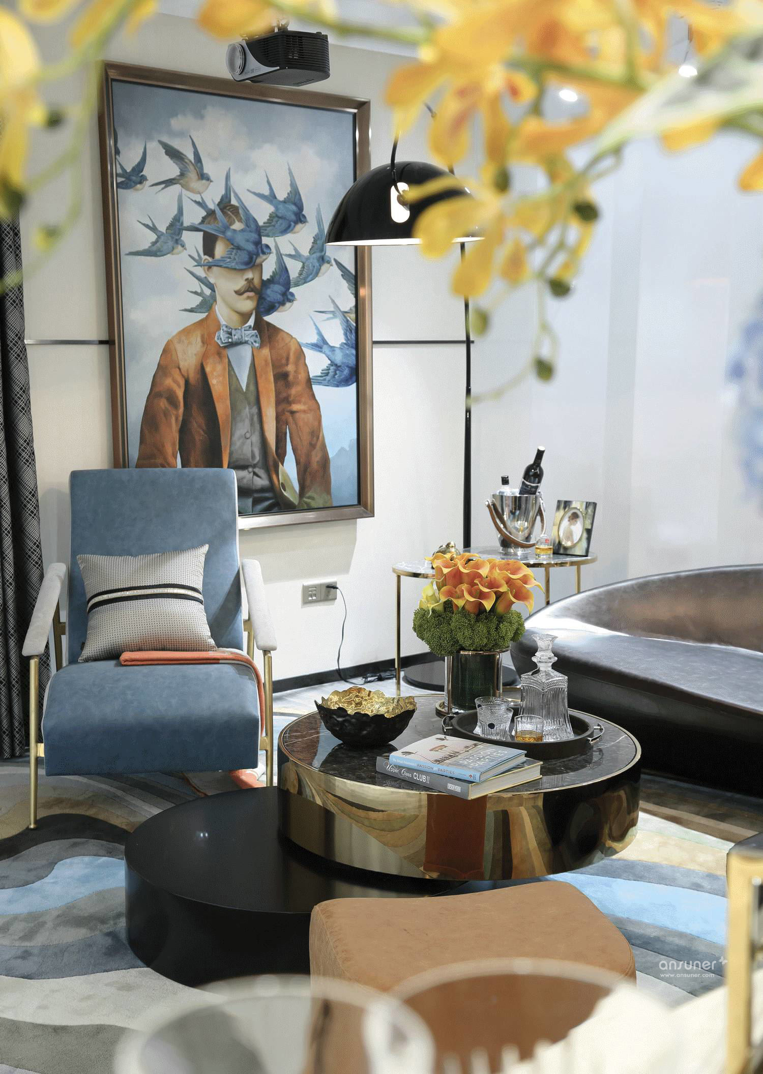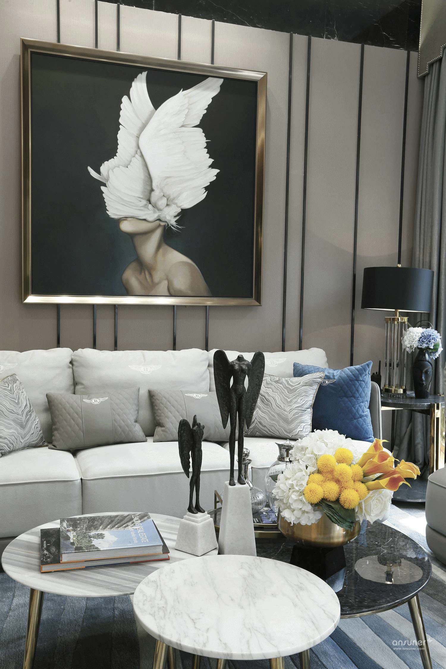客厅《守望天使》的当代画作,超现实主义的梦幻与先锋画派的高冷交织出迷离的美,与何多苓画布上仙气飘渺的花儿何其接近:茫然而诗意,传递出城市人普遍共有的精神特征,我们茫然地躬行在人生旅途,所幸头顶有诗意的星空可以仰望。