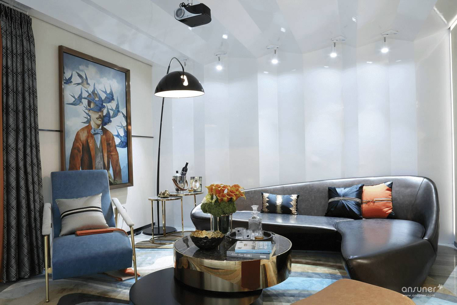立体的折纸墙面,爱玛仕橙与湖蓝色的碰撞,造型简约的沙发,当代艺术与传统文化的激荡,碰撞出独一无二的秘密花园,而影音室内的大面积留白,符合中国画的审美格调——无限想象,任由驰骋。