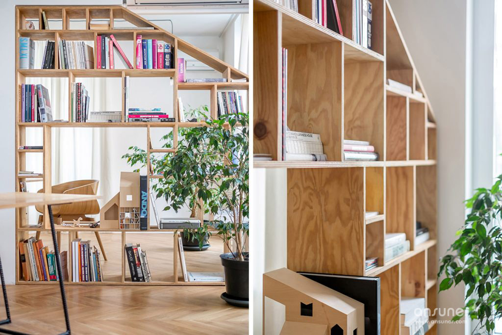 工作室包括两个主要工作区域,一个物理建模空间,一个会议室,一个厨房,一个浴室和两个露台。胶合板书架双重作为家具,使房间尽可能节省空间。在会议室和建筑空间之间,书柜可根据需要设置可拆卸元件,形成座位和侧桌,分离厨房和工作室空间的单元有一个内置的衣架。地板区分了房间,从各种布置的橡木地板到装饰瓷砖。 这些瓷砖意图类似于分散在太空中的地毯,营造出温馨的氛围。