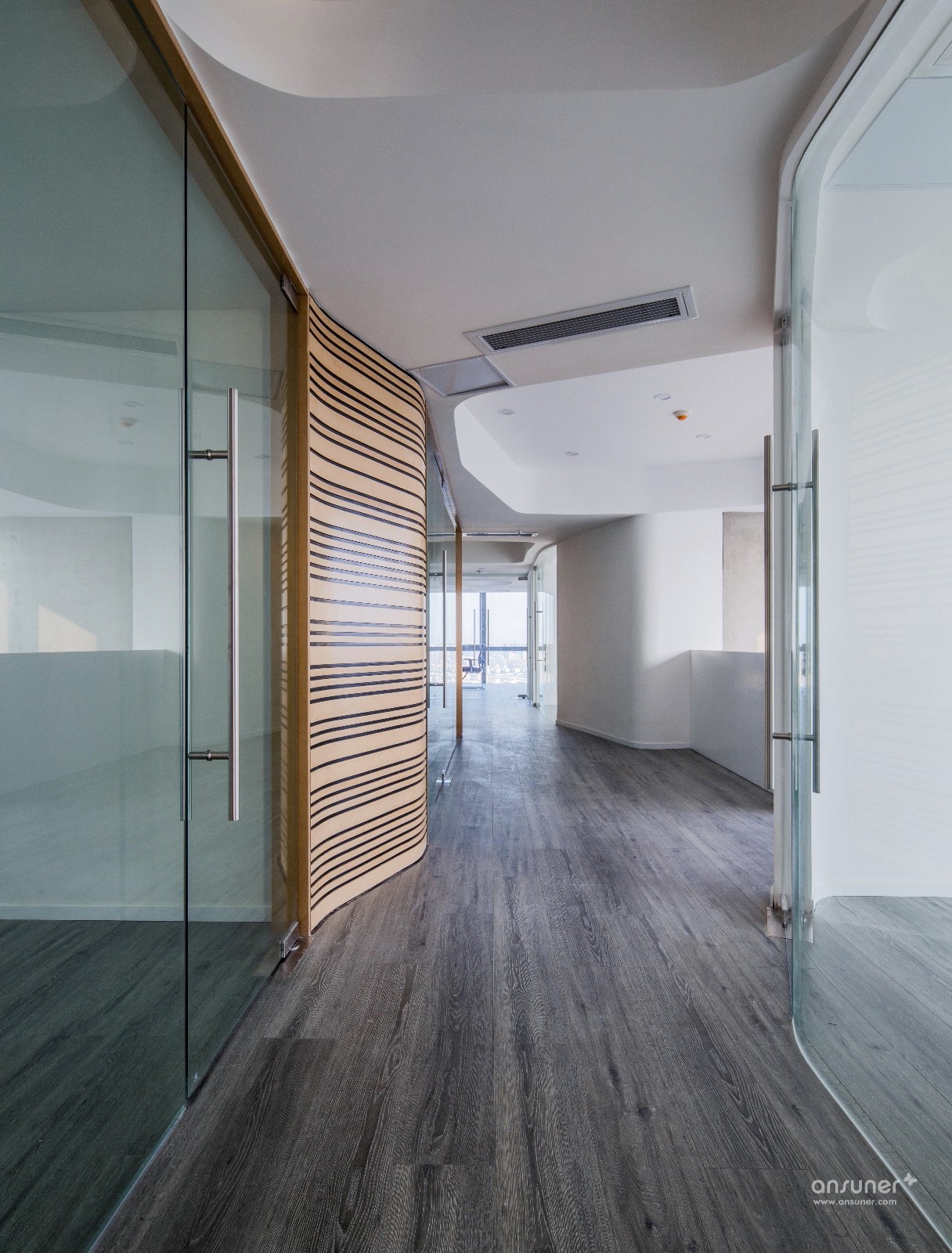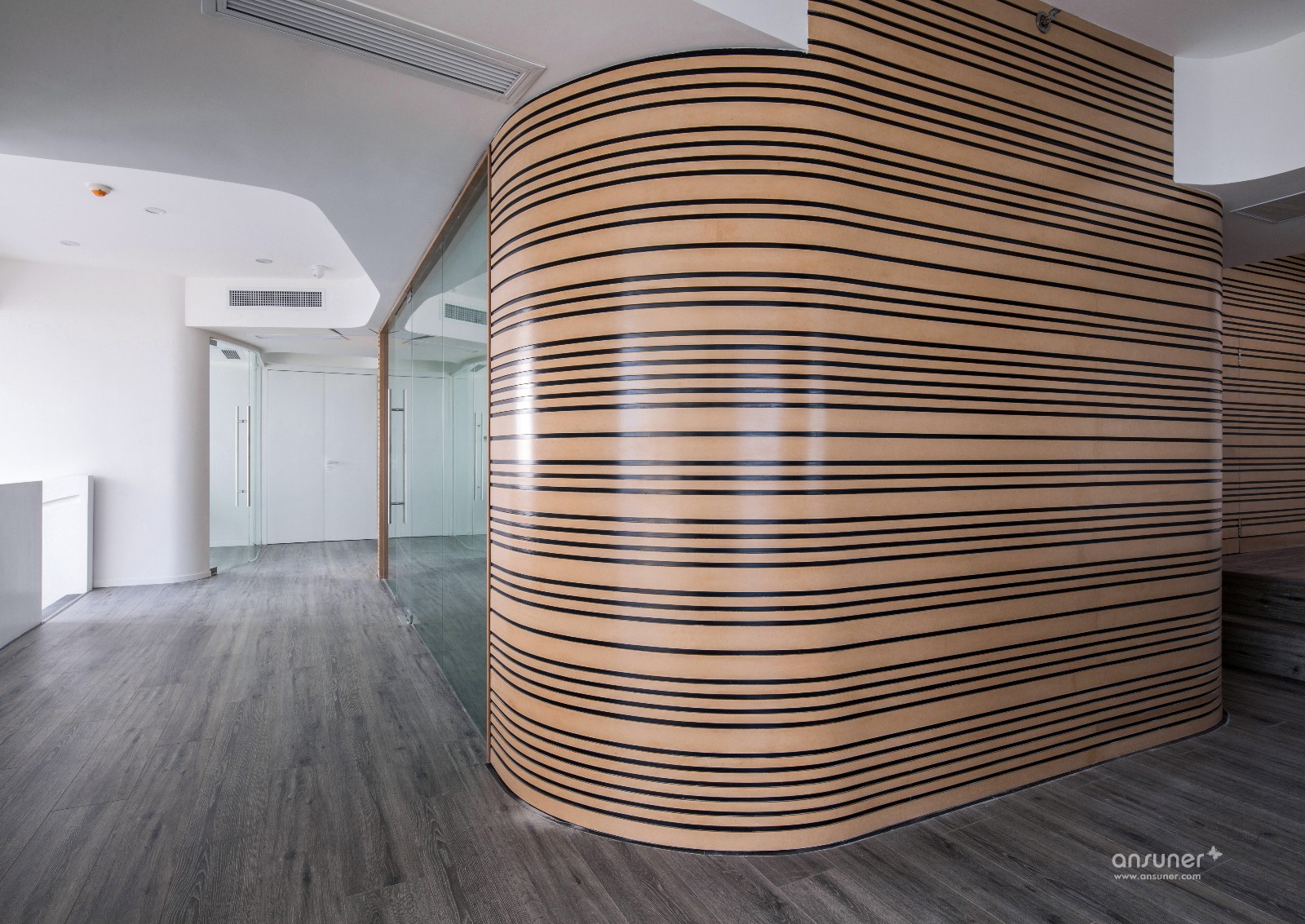 甲方最终敲定南京苏宁慧谷中心。新的办公室由5套50-70㎡不等的loft户型组合而成,一乘二的形式可以轻松获得双倍的办公面积。这也是Loft户型优点的最大体现,叠加赋予空间更强的可塑性,同时也带来层高相对局促的弊病,本案亦是如此。作为一家集产品研发、集成、销售、服务于一体的科技通信公司,业主提出了众多非常规的功能要求,如设立仓库、维修室、实验室、工具间等。这些相对独立的空间需要在布局中优化考虑,以确保实验、办公、出货的高效进行,同时还要克服空间的开阔性不够带来的采光不足等问题。如何将5套loft打通的狭长空间规划得有声有色,既满足功能需求又贴切公司的企业形象?这是设计师面临的主要问题。在此我们大胆运用了弧形线条作为主要设计元素,这样可以更加有效的对空间进行自由分割,同时打破办公室横平竖直、千篇一律的常态。从空间的布置分割到墙面的密集装饰线条,乃至楼梯的造型。曲形线、面无处不在。自由延伸的线条令人不禁遐想到无限蔓延的电波,更给人动态流畅的视觉感受。