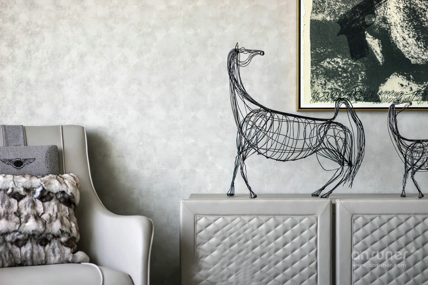 璀璨的水晶吊灯,做工精致的皮沙发,独具特色的茶几,Bentley经典的菱形格纹,点缀其间的大卫挂画,在同一空间,形成独到的艺术氛围与审美气度。而空间中的饰品,则在每一个细节上将低调奢华演绎得淋漓尽致。