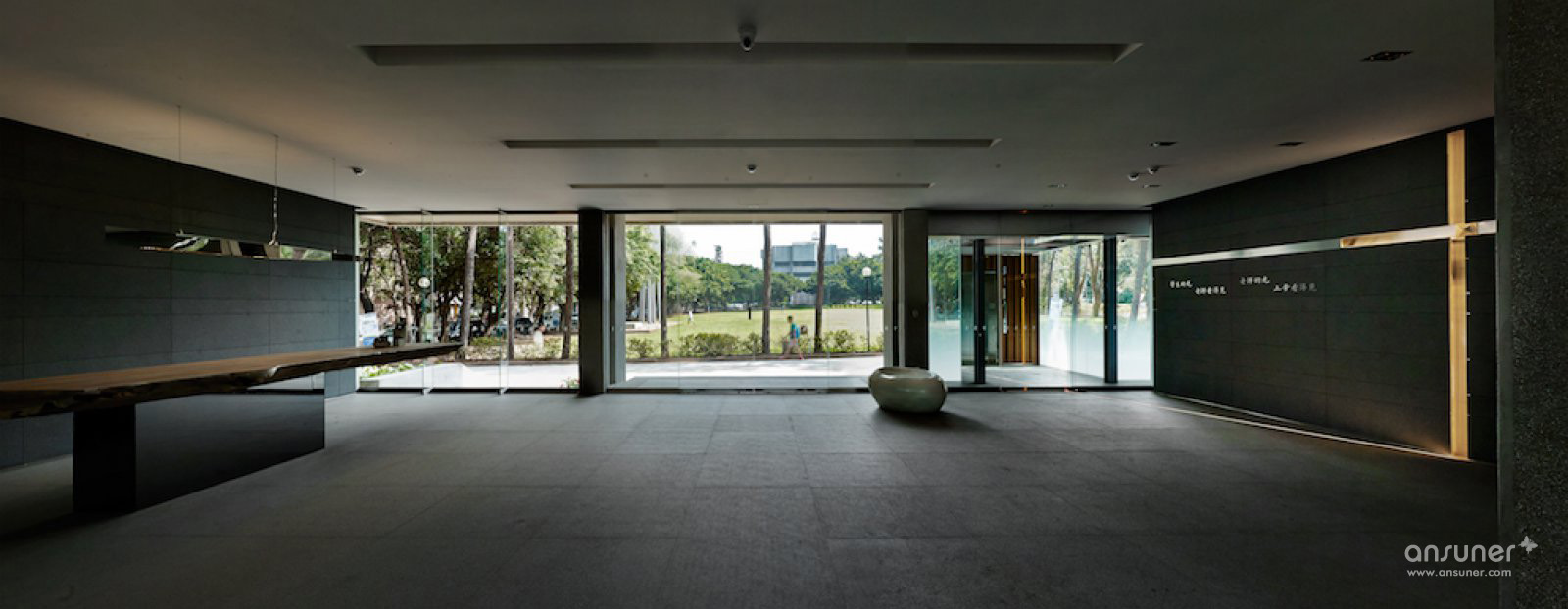 轴长条形的建筑物,循着梁柱结构的痕迹勾勒出长短两向轴线。短向轴线连结前后绿带草坪,长向轴线使左右两侧空间遥望对话。